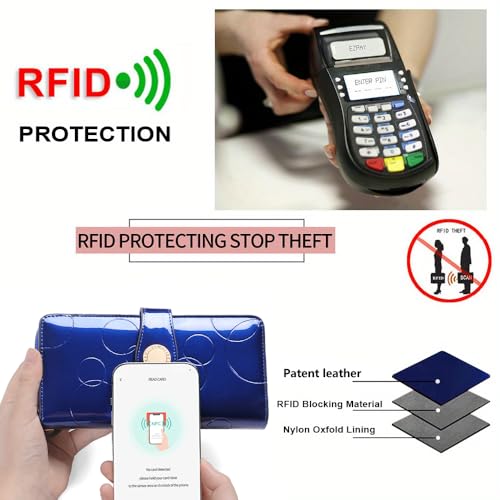 More information about Ladies' fashionable leather wallet, large capacity with multiple card slots, zipper and snap closure, RFID shielded credit card holder for protection, long wallet with wrist strap (Blue)