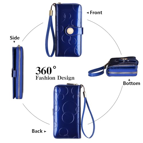HOT ! Ladies' fashionable leather wallet, large capacity with multiple card slots, zipper and snap closure, RFID shielded credit card holder for protection, long wallet with wrist strap (Blue)
