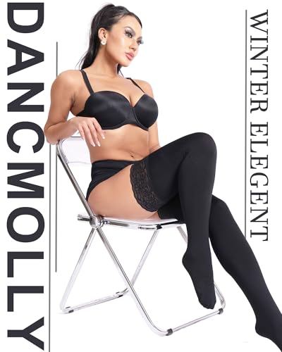 DancMolly Fleece Lined Thigh High Stockings Stay Up Warm Opaque Winter Tights Thermal Lace Top Fleece 8 Colors 1