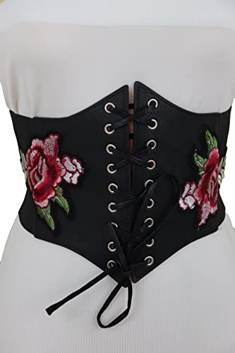 Women Black Corset Fashion Belt - Wide Elastic Waistband Red Rose Flower Size S M 1