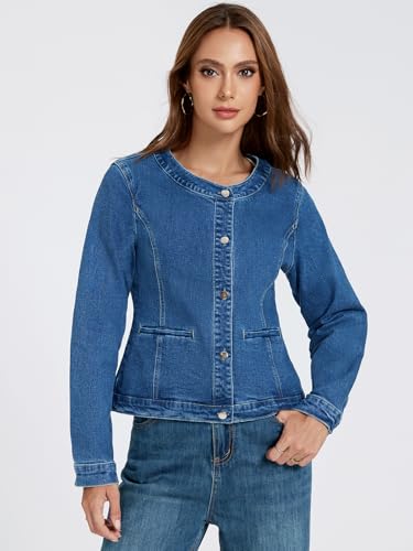 • Features: Slim fit; Collarless; Crew Neck; Long sleeve; Two front pockets, Button-front closures, Cropped jacket. Light weight denim jacket for women; Jean jacket women cropped; Collarless denim jacket for women