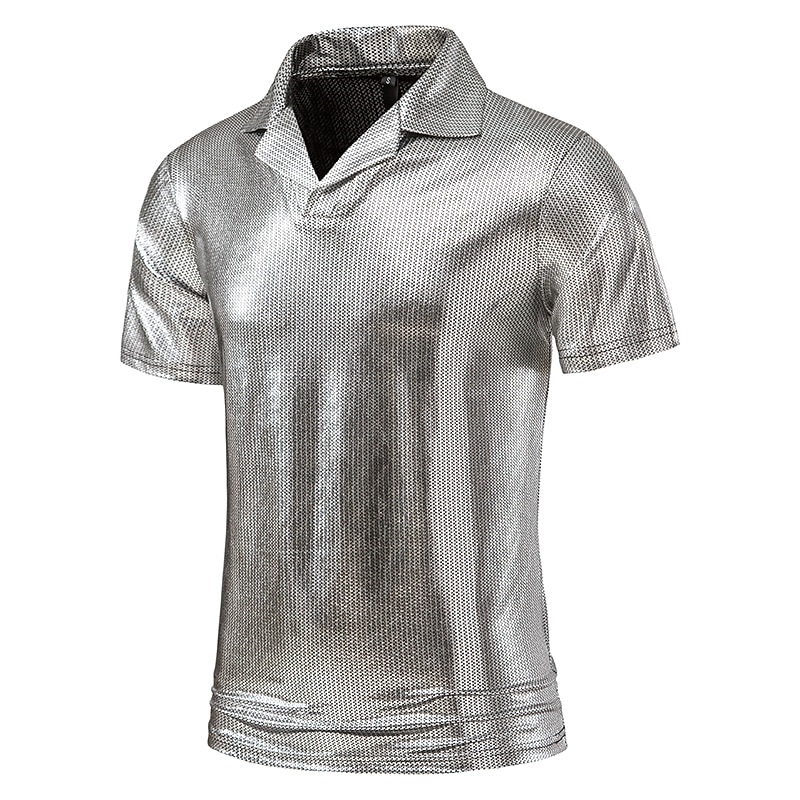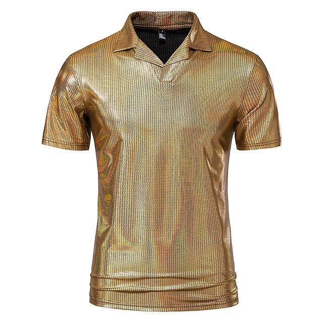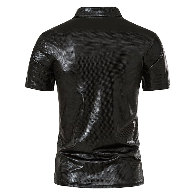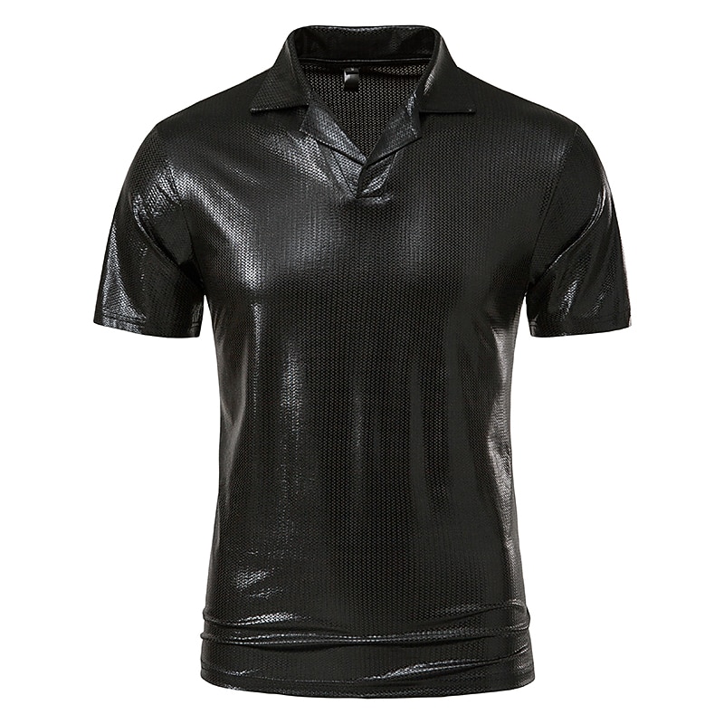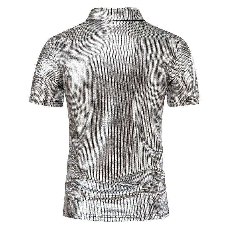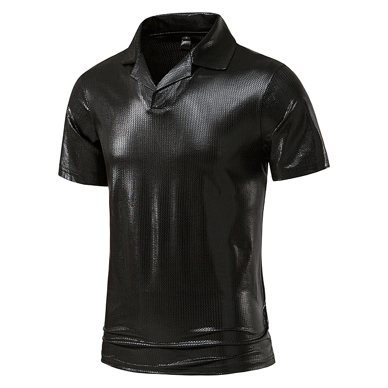Highlights [Fabric] : Crafted from high-quality polyester with synthetic blends, this men's polo shirt boasts a metallic sheen in gold, silver, or black, providing a glossy, reflective finish that adds a bold touch to any outfit. [Fit] : The shirt is designed in a regular fit that provides a modern and comfortable silhouette. With short sleeves and a slightly tailored shape, it ensures ease of movement while retaining its stylish form. [Design Highlights] : This polo features a distinctive Cuban collar paired with a classic lapel, and a button front closure that enhances its novelty appeal. The unique wave pattern further elevates its trendy design, making it a standout piece in any wardrobe. [Occasions] : Ideal for club events, casual outings, or any occasion where you want to make a fashionable statement. Its lightweight and eye-catching design make it perfect for nightlife and social gatherings. [Size Availability] : Available in a wide range of sizes, from S to XXL, accommodating various body types for a flattering fit. The shirt's stretchable material ensures comfort across all sizes.