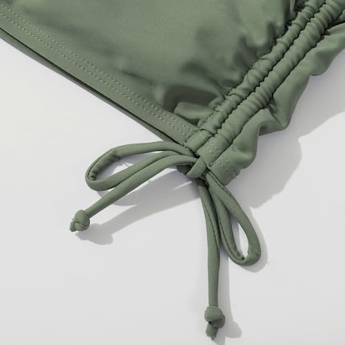 • Girls' Bikini Sets: This girls' two-piece swimsuit set features a sleeveless top with a one-shoulder ruffle design and a spaghetti straps on the other side. The top has a drawstring detail and a tropical print along the neckline.