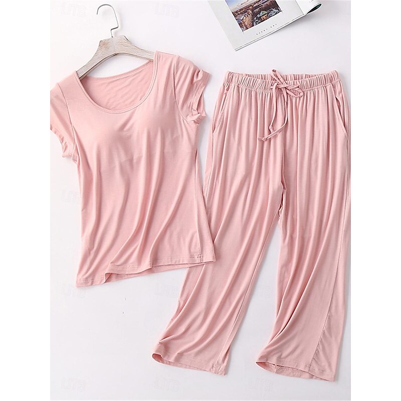 Women's Pajamas Sets Pure Color Simple Comfort Home Daily Bed Modal Breathable Crew Neck Short Sleeve T shirt Tee Pant Chest pads Summer Home Outfits 1