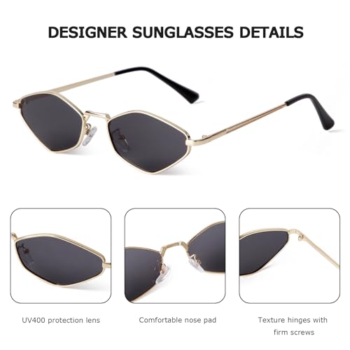 • RETRO CHIC IRREGULAR FRAME: Trendy gold sunglasses for women men with skinny narrow metal frame are keeping up closely with the latest fashion trend, offering a modern and sophisticated look. These retro small hexagonal sunglasses women can match with various facial shapes