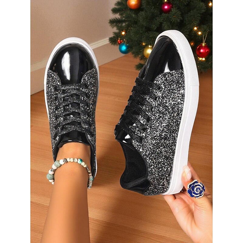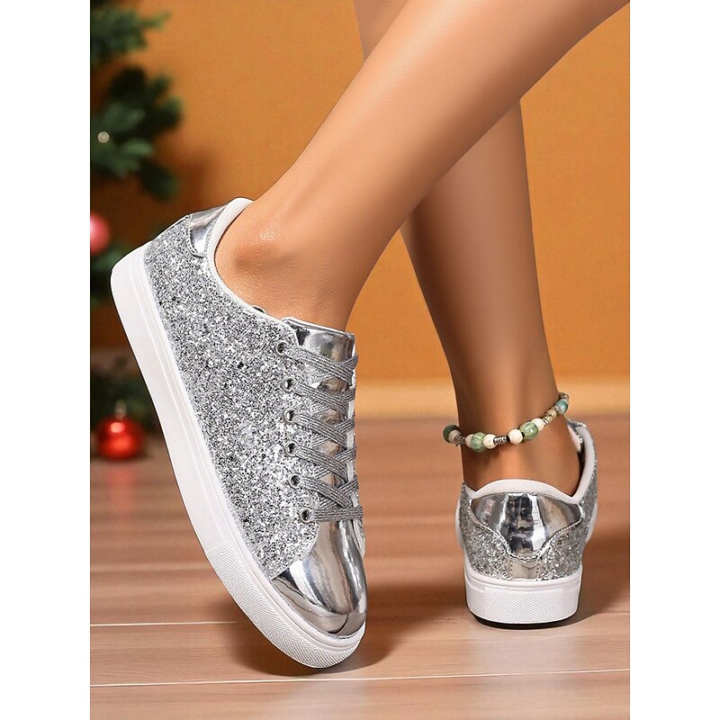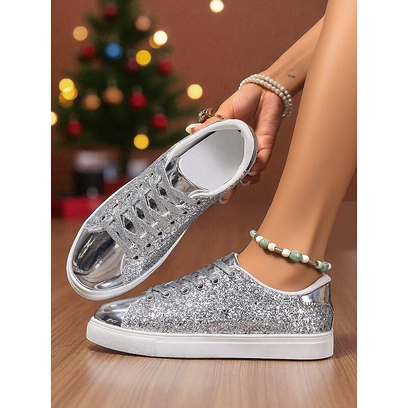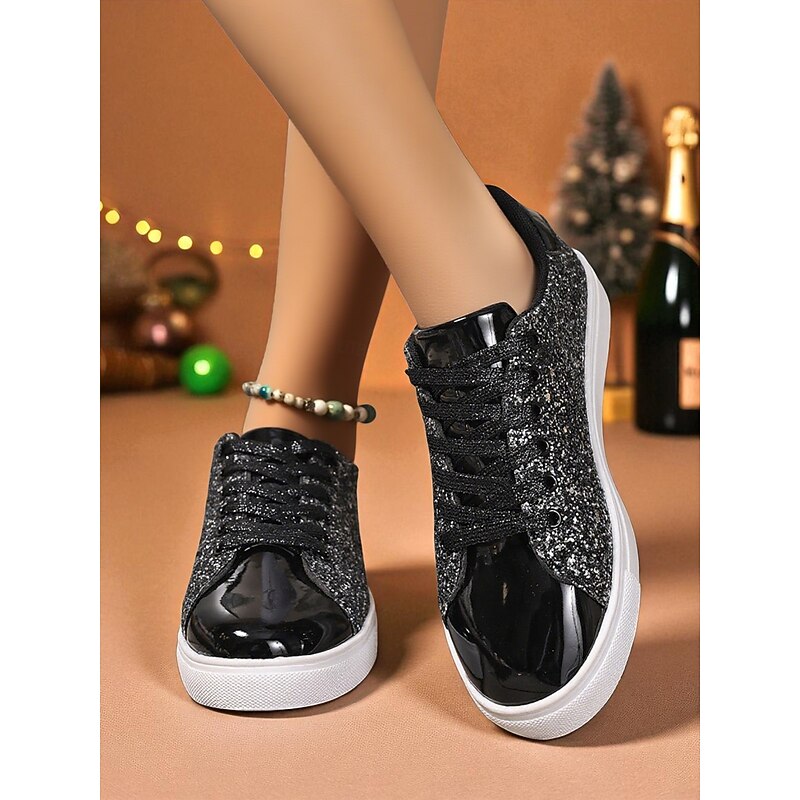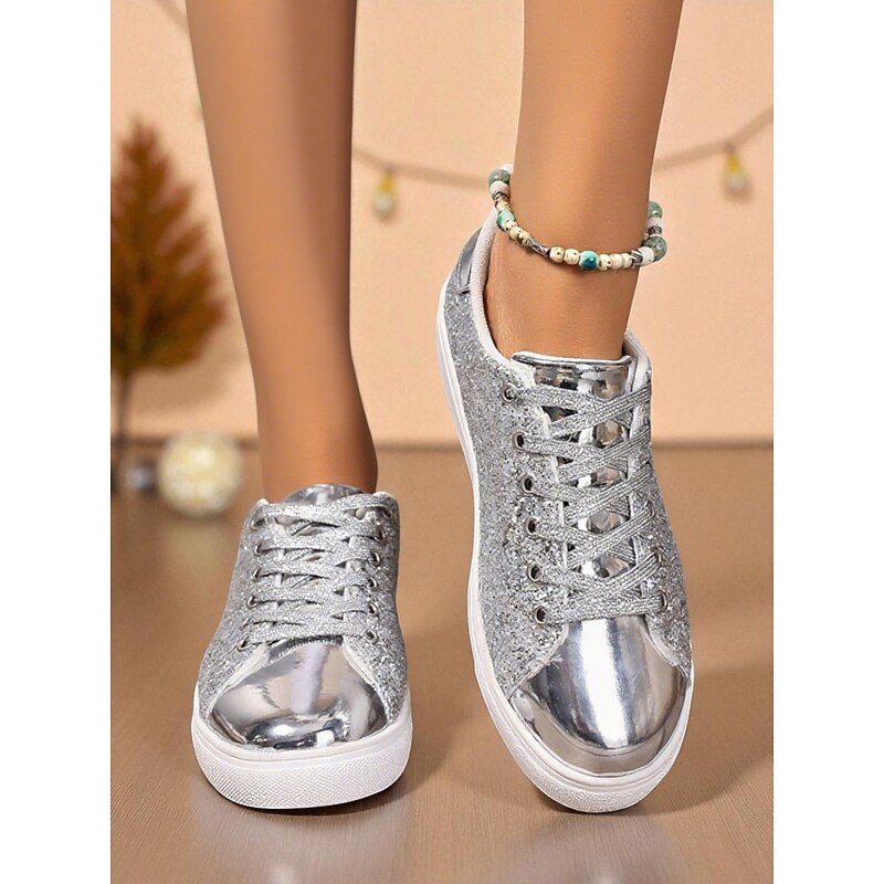 HOT ! Women's Gold Glitter Lace-Up Sneakers with Metallic Toe Cap - Trendy Nightlife Party and Clubwear Shoes