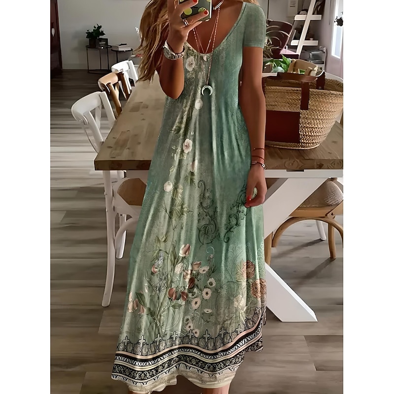 Women's Midi Dress Sundress A Line Dress Vacation Casual Boho Going out Beach Standard Fit Floral Graphic Short Sleeve V Neck Gray Green White Light Green Red Summer Spring 2