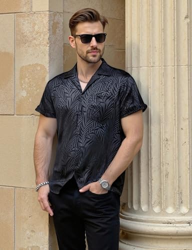 Mens Shiny Satin Silk-Like Designer Shirt Summer Regular Fit Short Sleeve Button Up Floral Shirt with Pocket 6
