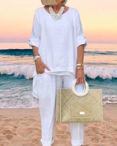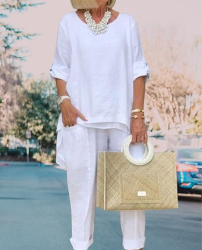 HOT ! Women Linen 2 Piece Pants Suit for Women Dressy Cotton Linen Sets Outfits Long Sleeve Shirts Wide Leg Trousers