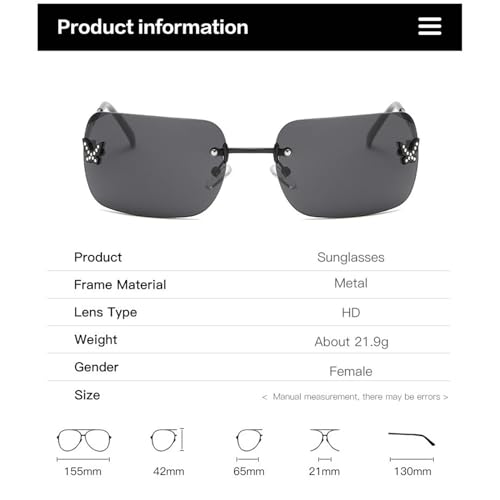• 【Rectangular Y2k Sunglasses】Y2k sunglasses for women are very stylish and curved to fit perfectly to the face. The rimless rectangular design highlights the beauty of the glasses, and the metallic temple designs and shiny little butterflies on the lens are full of y2k.