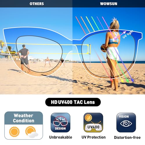 • Optimum Vision Performance - WOWSUN design the lenses to fit precisely with the frame for a tailored experience that delivers clear vision from every angle. These sunglasses are equipped with polarized lenses and UV 400 protection, ensuring your eyes are shielded from harmful rays. Whether you're wearing retro sunglasses or a more modern trendy design, you can trust that your vision will be both clear and protected.