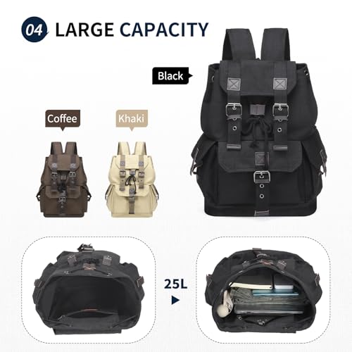 Vintage Canvas Backpack for Men Women, Durable Casual Daypack, Large Capacity Travel Rucksack Fits for Hiking and Daily Use (Black) 5