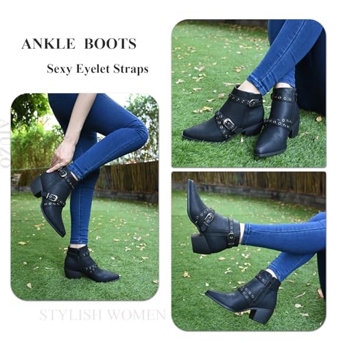 Ankle Boots for Women Chunky heels Booties with Side Zipper Eyelet Straps Almond Toe Short Boots,Black 5