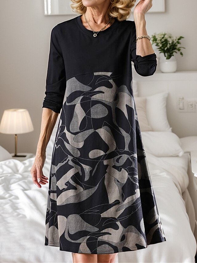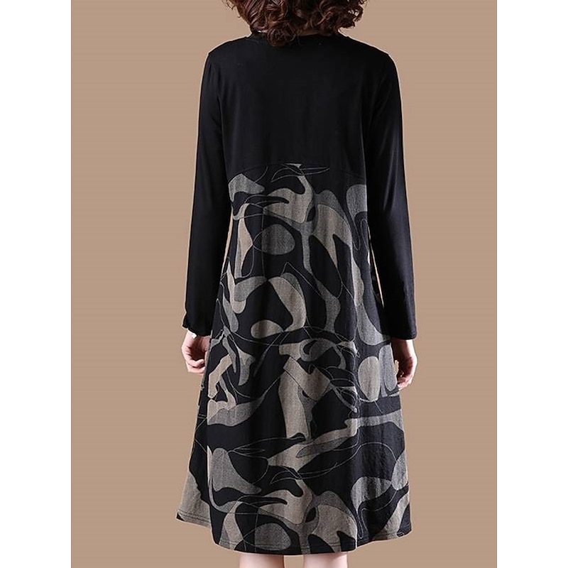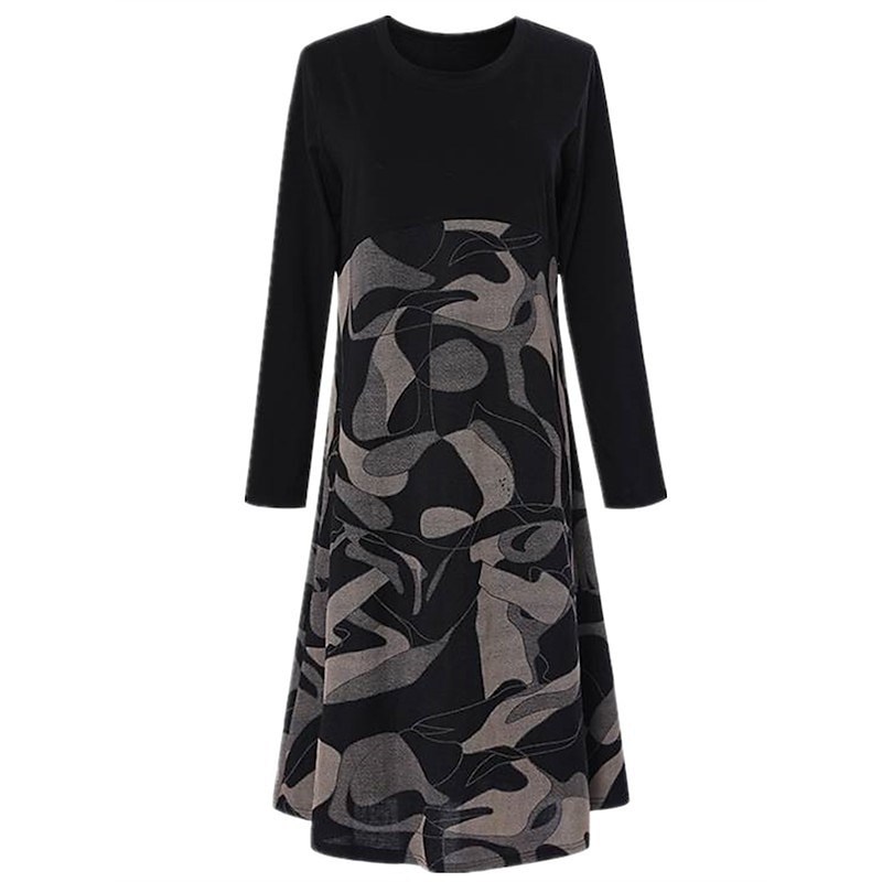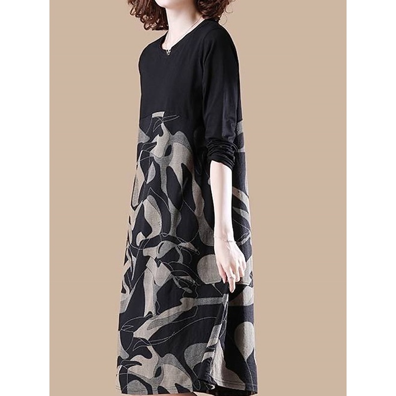 Highlights [Fabric] This women's casual dress is crafted from high-quality polyester fabric, ensuring durability while offering micro-elasticity for added comfort. The material is designed to be breathable, making it ideal for fall and winter wear. [Silhouette] The dress features an elegant A-line silhouette that flatters a variety of body types. Its regular fit ensures both style and ease of movement, making it suitable for daily wear or active street style. [Design Highlights] With a contemporary design, this dress combines a classic crew neck with a striking color block and floral patchwork print. The long sleeves and abstract black and grey pattern add a touch of sophistication and modern flair to the ensemble. [Occasions] Perfect for a range of occasions, this versatile dress is suitable for vacations, casual street outings, and daily activities. Whether for a relaxed day out or a stylish evening gathering, it adds charm and elegance to any setting. [Size Availability] The dress is available in multiple sizes, including M, L, XL, XXL, and 3XL, accommodating a wide range of body measurements for a perfect fit.