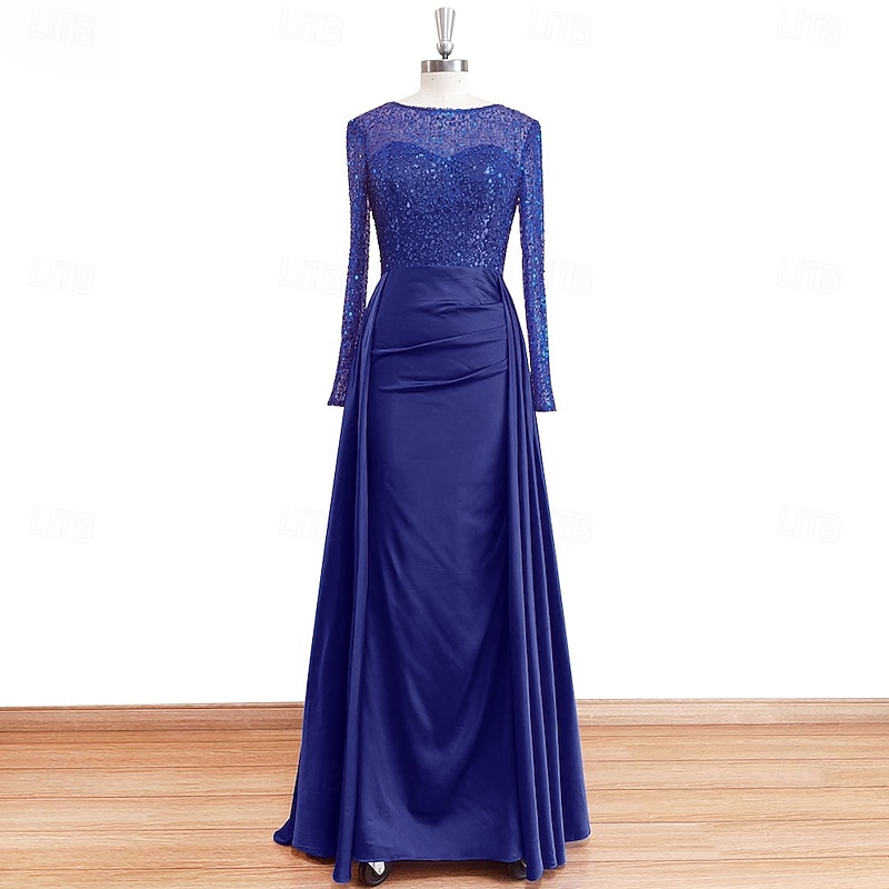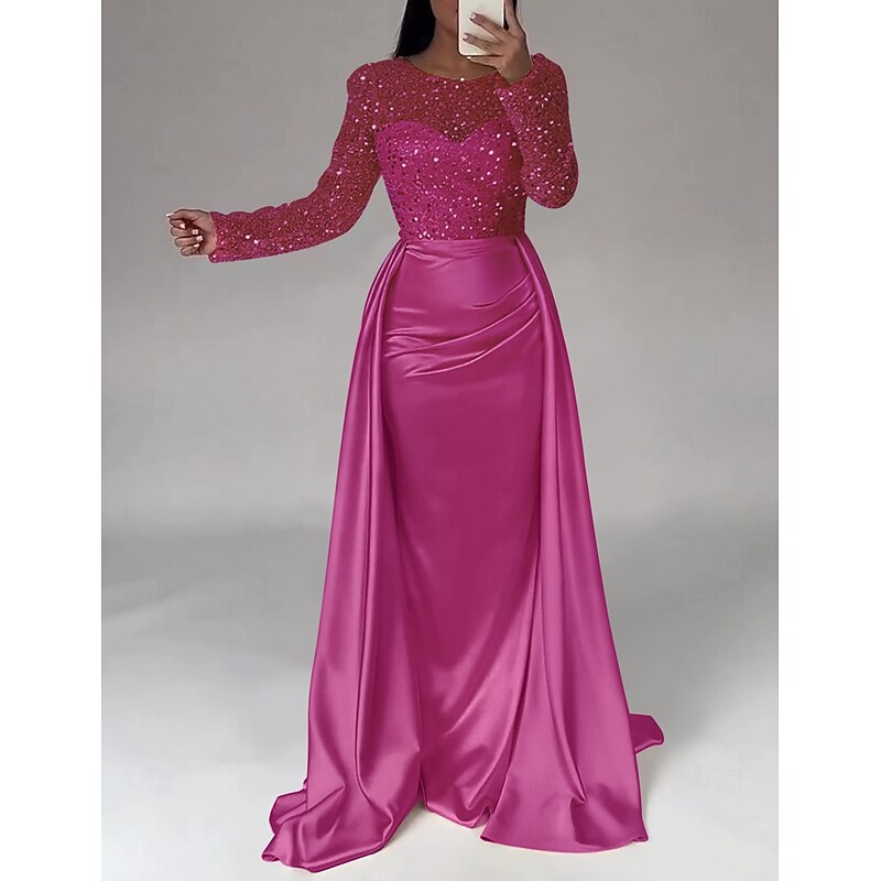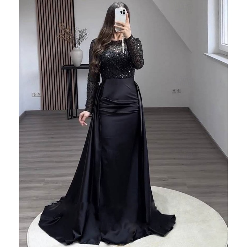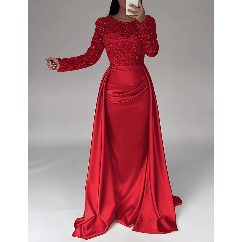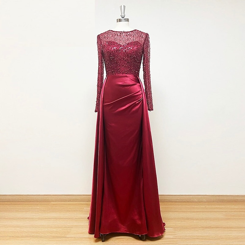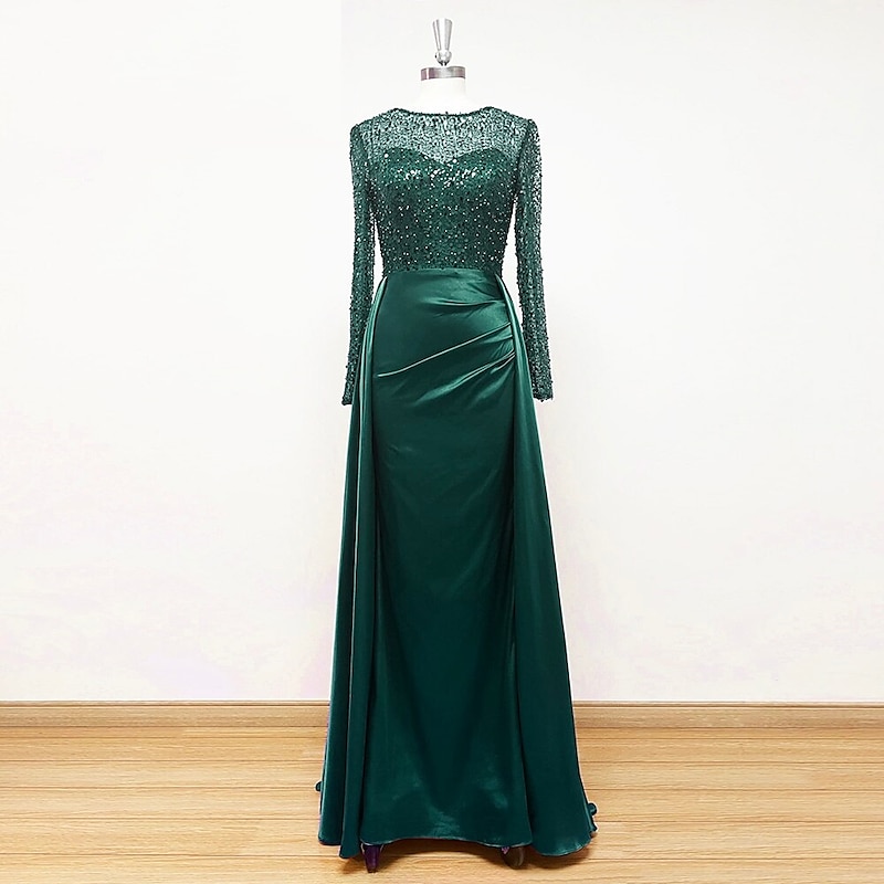 Mermaid Sequin Evening Gown RuchedSatin Dress Long Sleeves Masquerade Floor Length Illusion Neck with Pearls Overskirt dress 1
