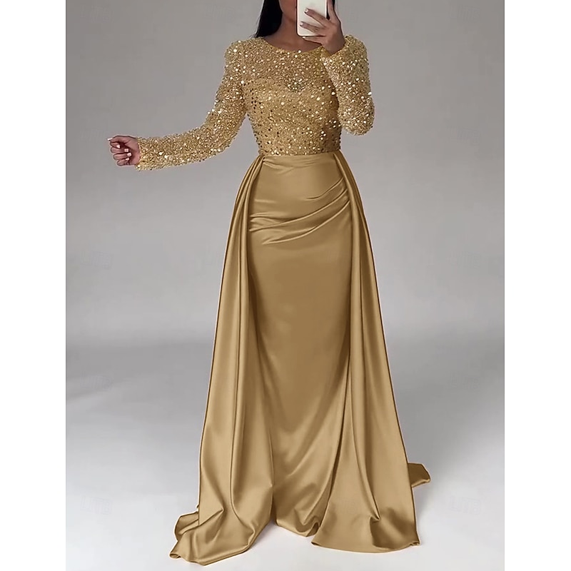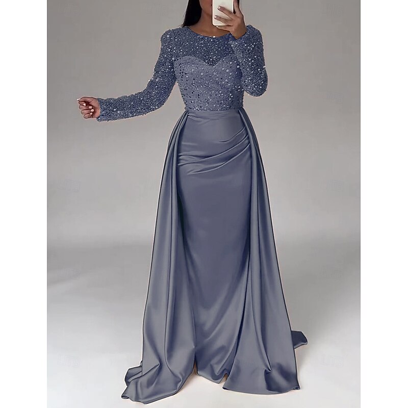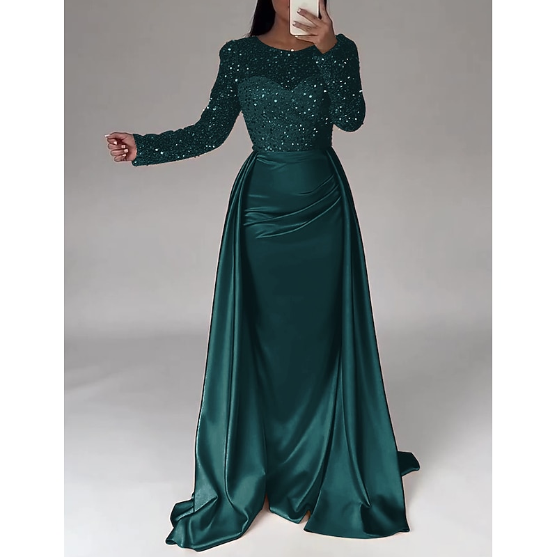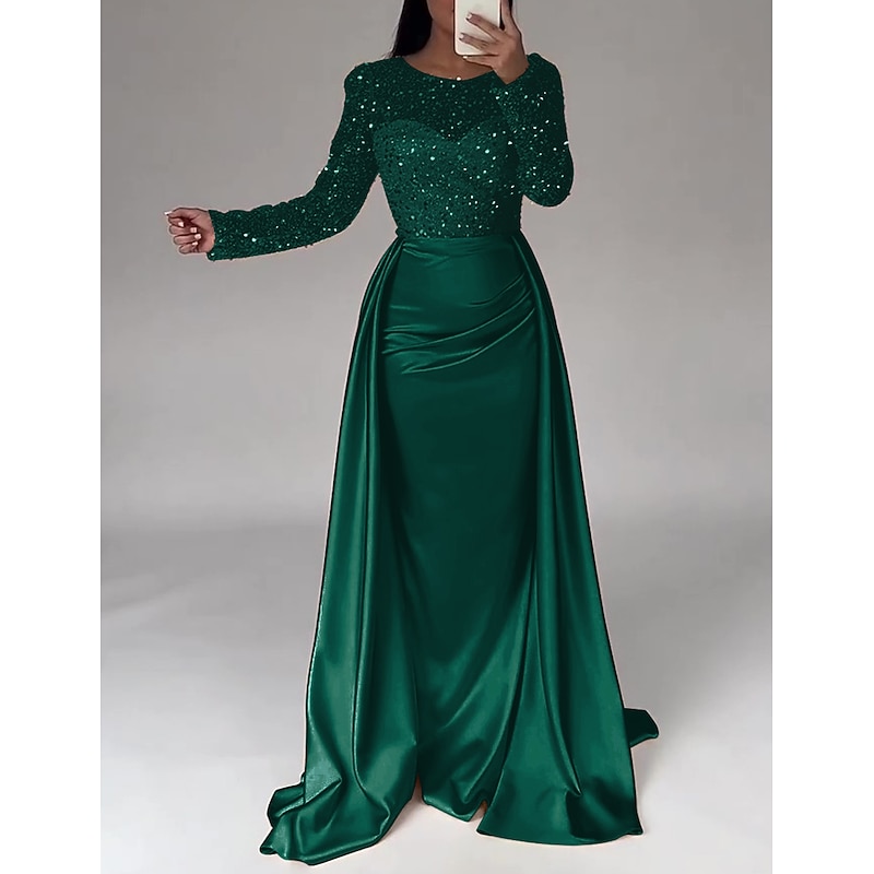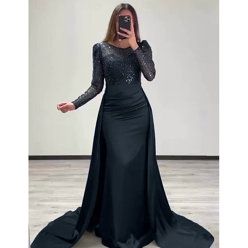 More information about Mermaid Sequin Evening Gown RuchedSatin Dress Long Sleeves Masquerade Floor Length Illusion Neck with Pearls Overskirt dress