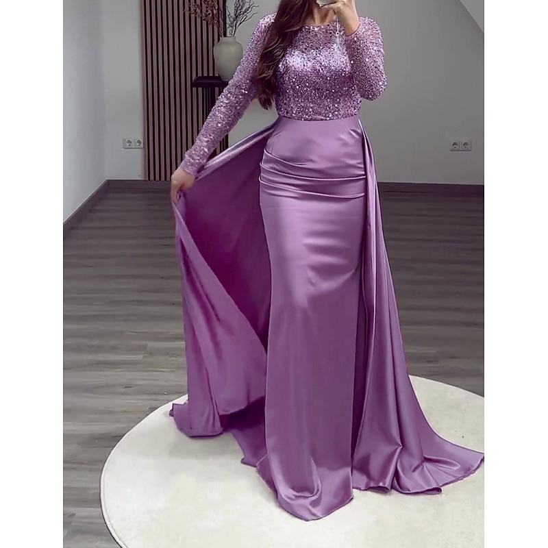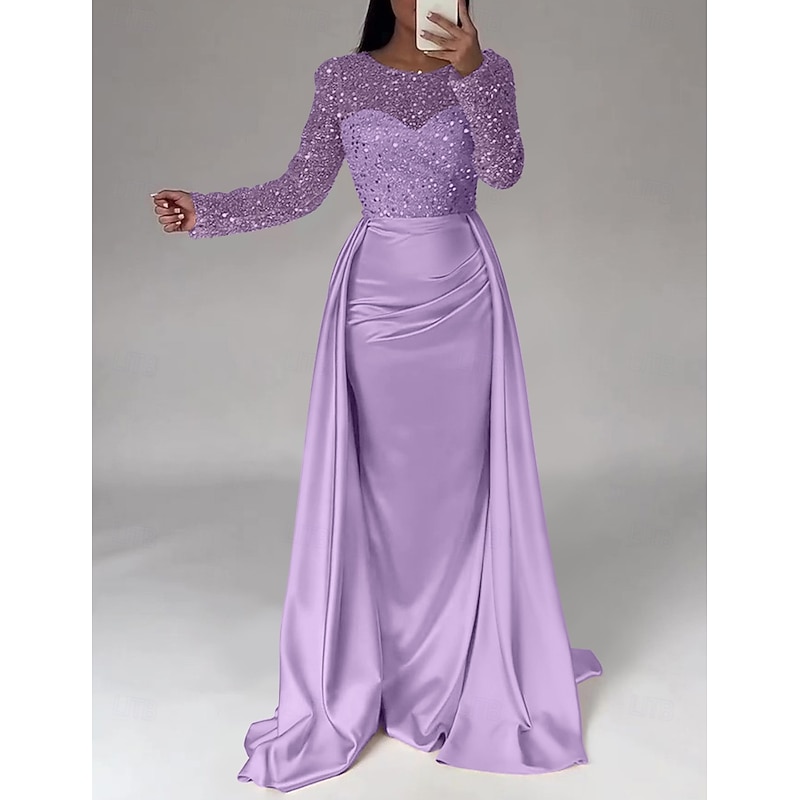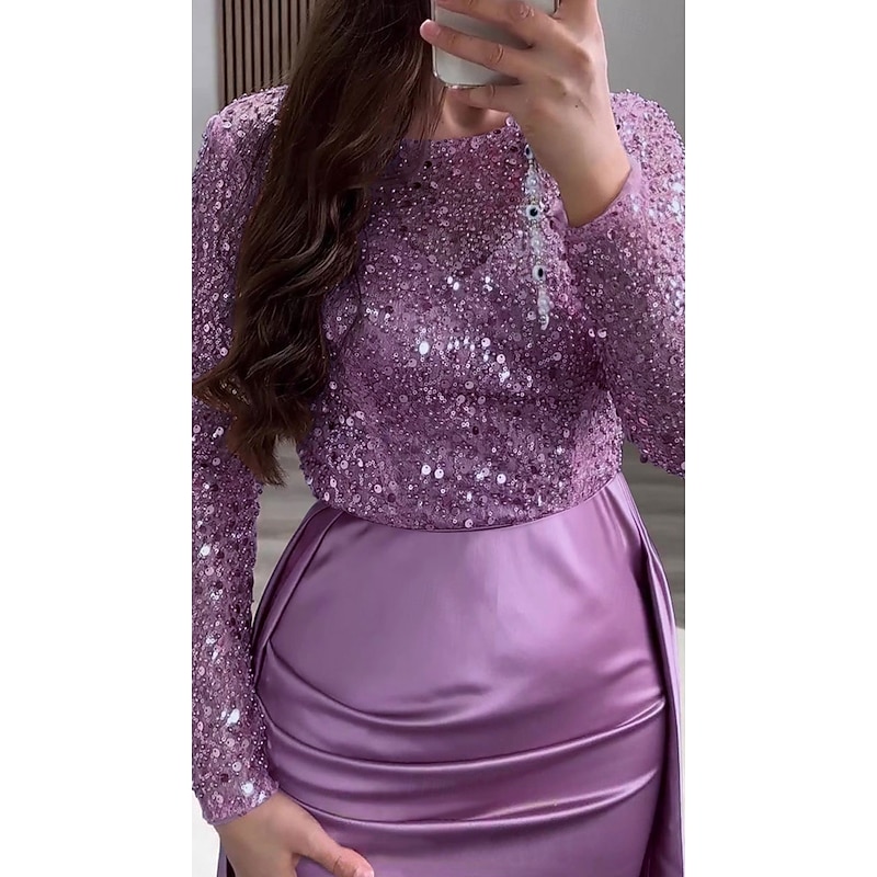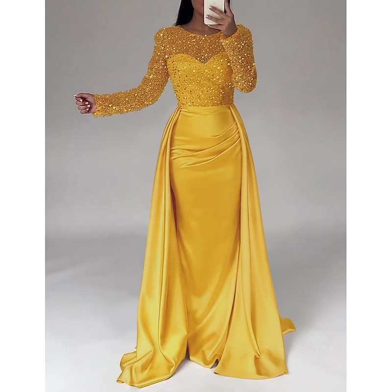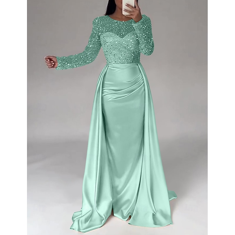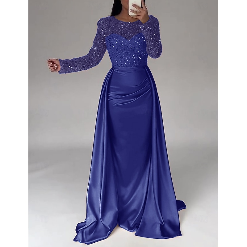 More information about Mermaid Sequin Evening Gown RuchedSatin Dress Long Sleeves Masquerade Floor Length Illusion Neck with Pearls Overskirt dress