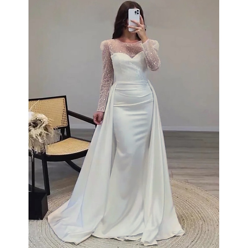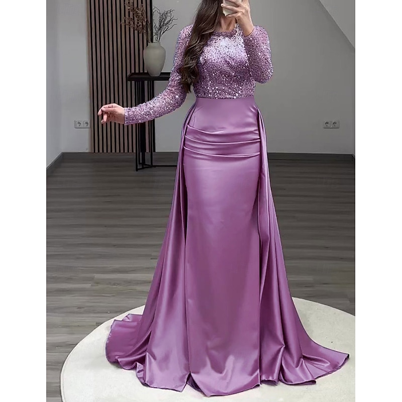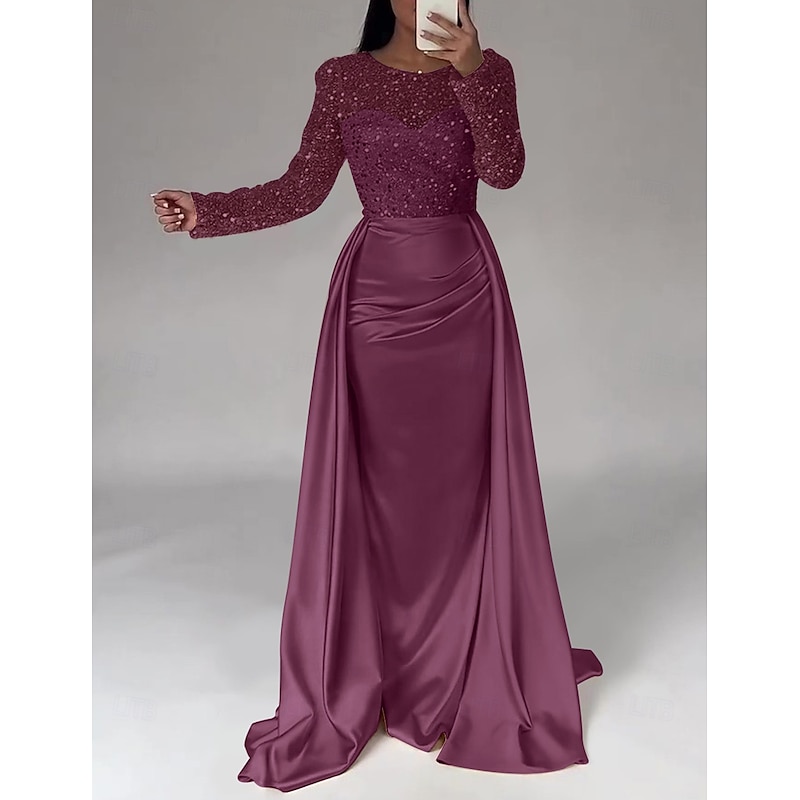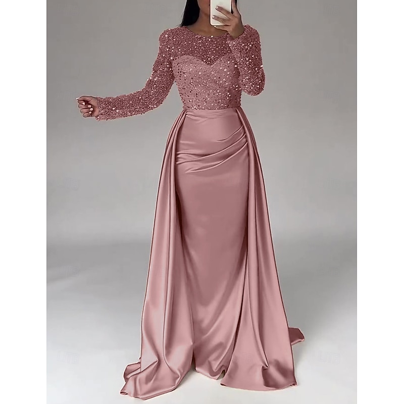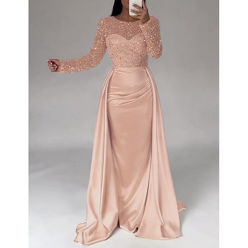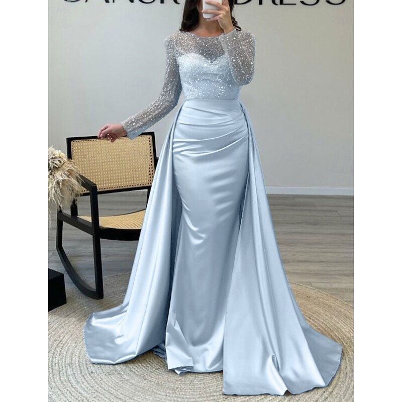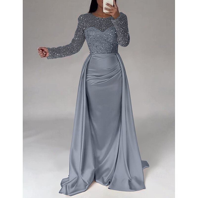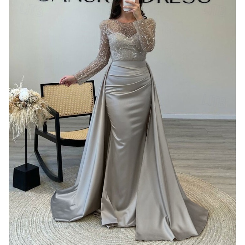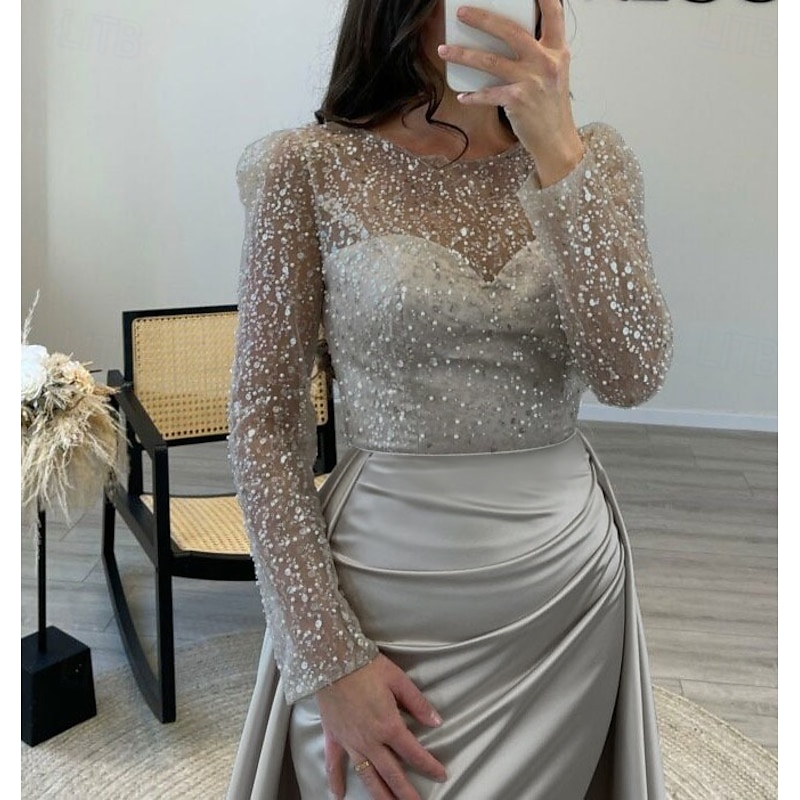 Mermaid Sequin Evening Gown RuchedSatin Dress Long Sleeves Masquerade Floor Length Illusion Neck with Pearls Overskirt dress 41