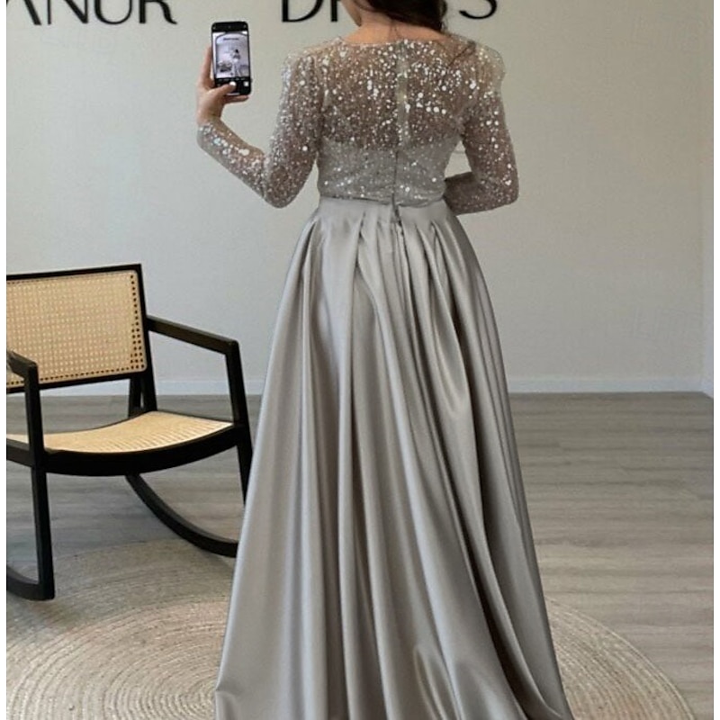 Mermaid Sequin Evening Gown RuchedSatin Dress Long Sleeves Masquerade Floor Length Illusion Neck with Pearls Overskirt dress 37