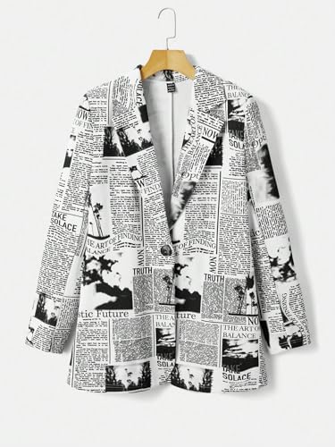 • Features: allover newspaper print for a trendy look, lapel neck, button front, reputation blazer.