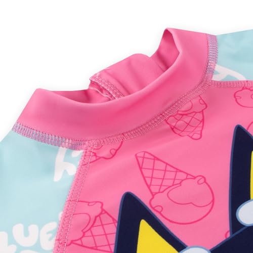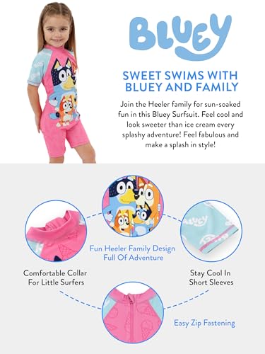 • Official Bluey Merchandise: Decked with the beloved Heeler family and playful dark pink ice cream cones, this one-piece Bluey swim suit is a must-have for young enthusiasts. The iconic Bluey logo against the pink background with light blue sleeves makes it an essential piece of Bluey girls swimsuit collection.