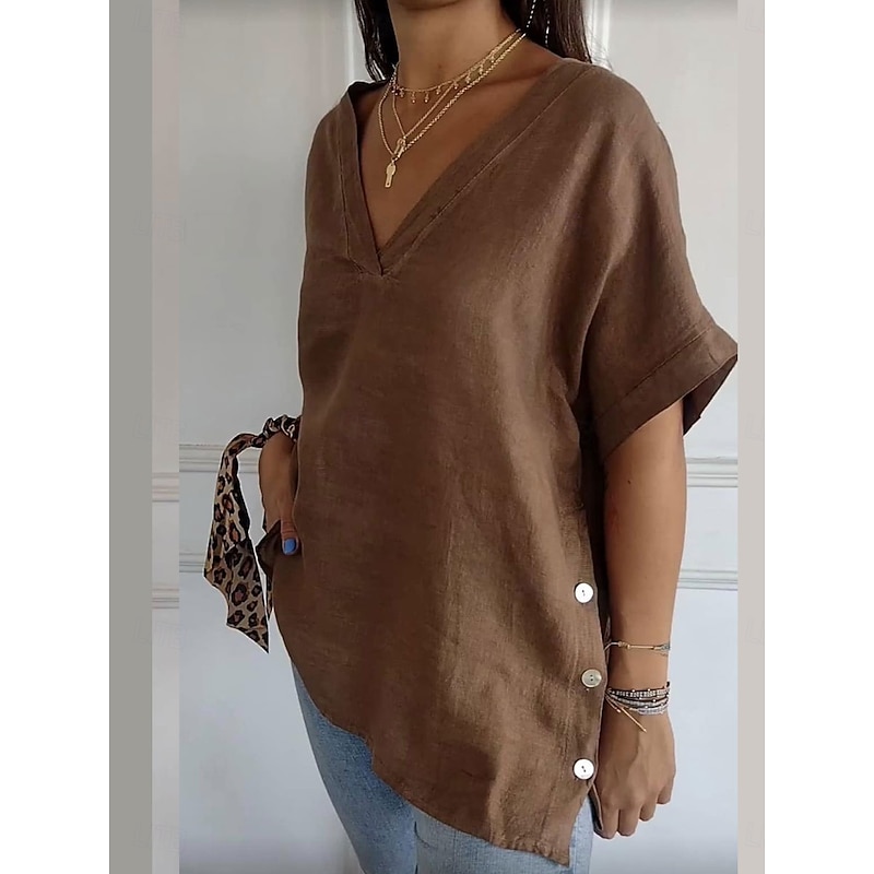HOT ! Women's Cotton Linen Blouse Solid Color Elegant Casual Short Sleeve V Neck Regular Tops Daily Holiday Buttons Black White Brown Summer