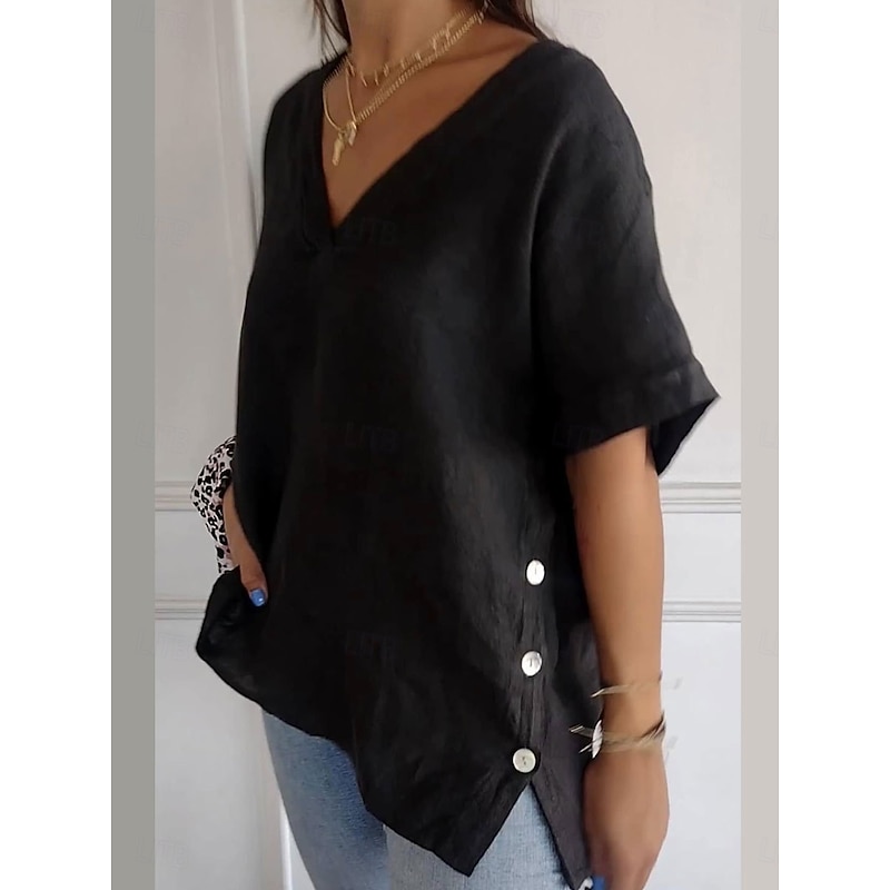 More information about Women's Cotton Linen Blouse Solid Color Elegant Casual Short Sleeve V Neck Regular Tops Daily Holiday Buttons Black White Brown Summer
