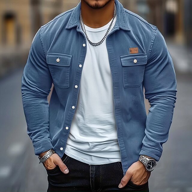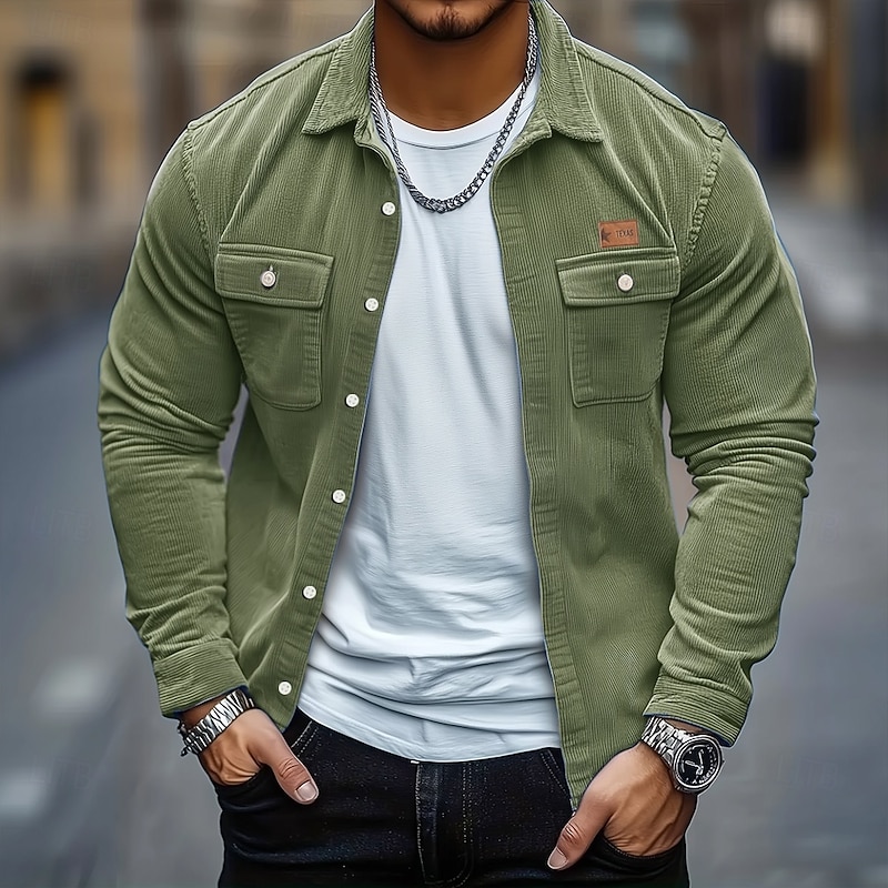 Men's Solid Color Corduroy Shirt Shirt Jacket Overshirt Long Sleeve Casual Outdoor Dailywear Fall Winter Turndown Button-Down Warm Jacket with Flap Pockets Red Blue Green Khaki Gray 11