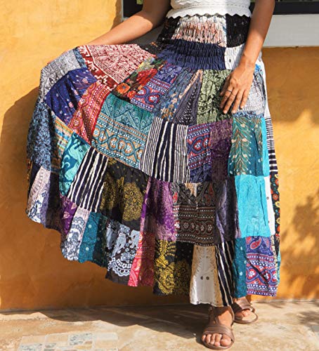 • This flamboyant patchwork skirt has a very generous full design. Four tiers of bright multicolored squares falling beautifully from the deep smocked waistband to swirl and cascade around the ankles