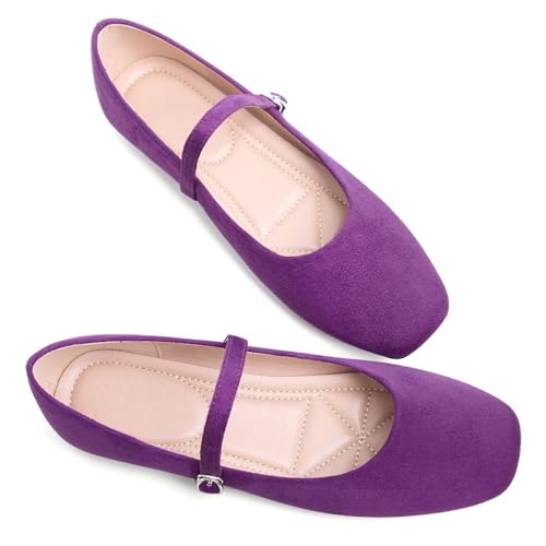 Stunner Women's Mary Jane Ballet Flats Fashion Square Toe Ankle Strap Flats Comfortable Casual Slip On Dress Shoes Dark Purple 42(9.5) 2 6