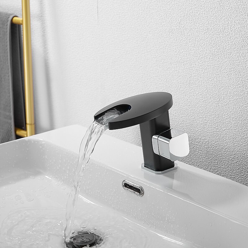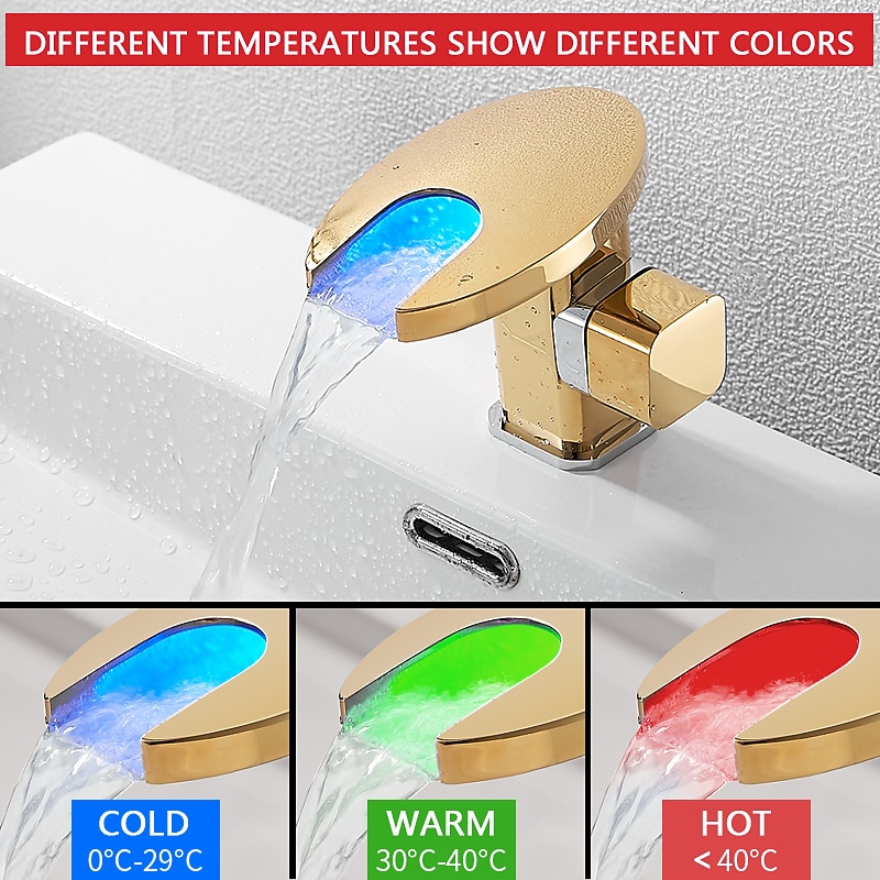 HOT ! Bathroom Sink Faucet,LED Waterfall Temperature Controlled 3-Colors Electroplated Centerset Single Handle One Hole Bath Taps