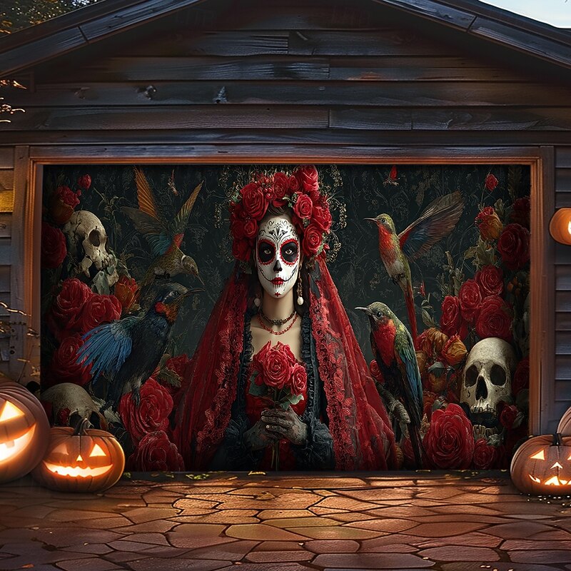HOT ! Halloween Outdoor Garage Door Cover Gothic Sugar Skull Skeletons Banner Large Tapestry Backdrop Decoration for Holiday Outdoor Garage Door Home Wall Decorations