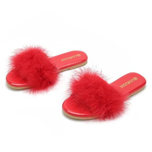 LIURUIJIA Women's Fluffy Feather Slippers Fur Slide Flat Sandals Cozy Slip On Stylish Summer Casual Party Indoor Outdoor Flats Shoes 7