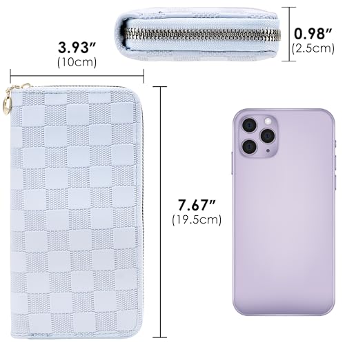 HOT ! Checkered Zip-Around Wallet for Women, Faux Leather Credit Card and Cash Holder, Long Clutch Phone Purse, Light Blue
