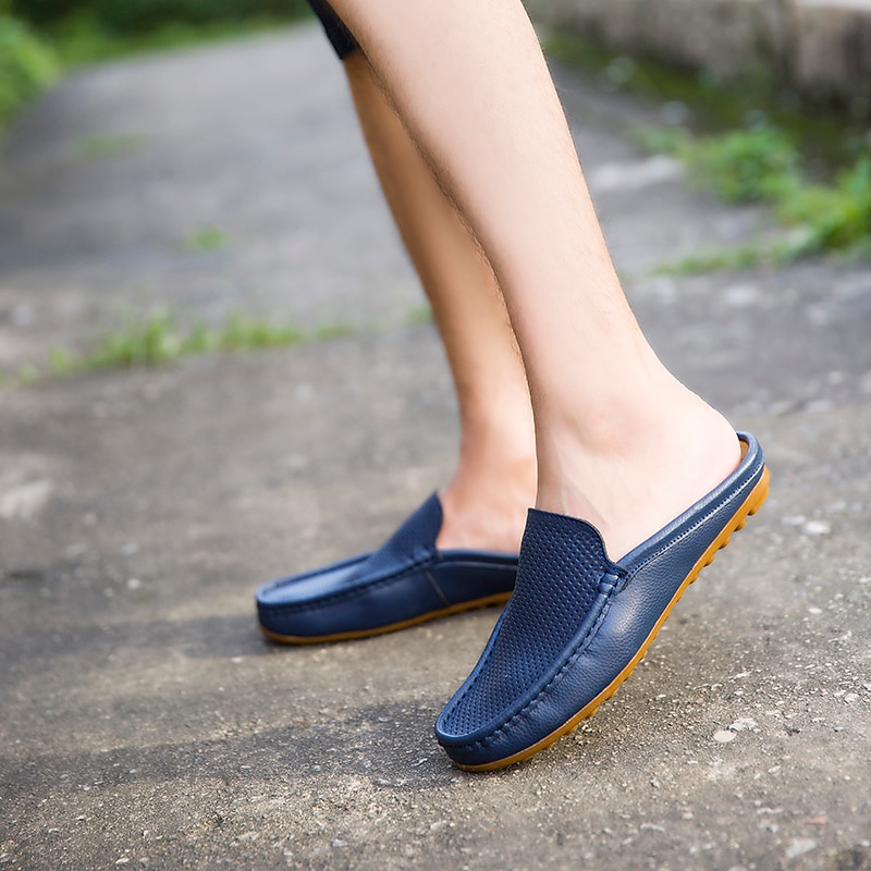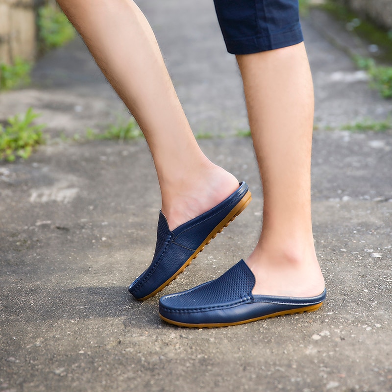 Men's Blue Faux Leather Mule Loafers – Slip-On Driving Shoes with Perforated Upper for Casual Outings, Travel, and Summer Wear