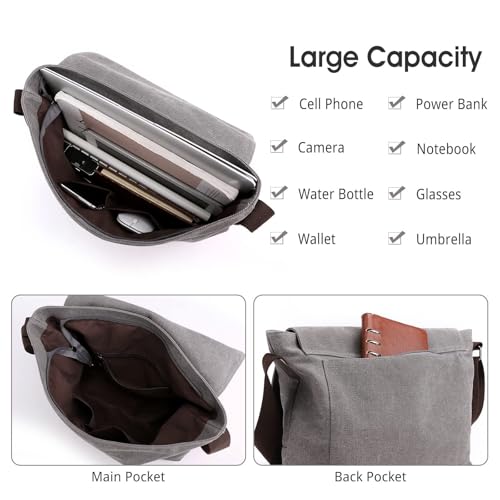 • 【High Quality】Top quality soft canvas and durable polyester lining for tear- and rip-resistant strength. The durable offers reliable performance that stands up to everyday wear and tear. Hard metal fittings, smooth zipper, compact and strong wiring, adjustable shoulder straps, perfect details make this product perfect. Slim messenger construction with snap closures under the leather flap.