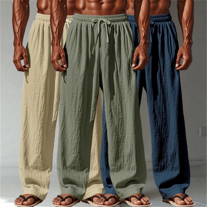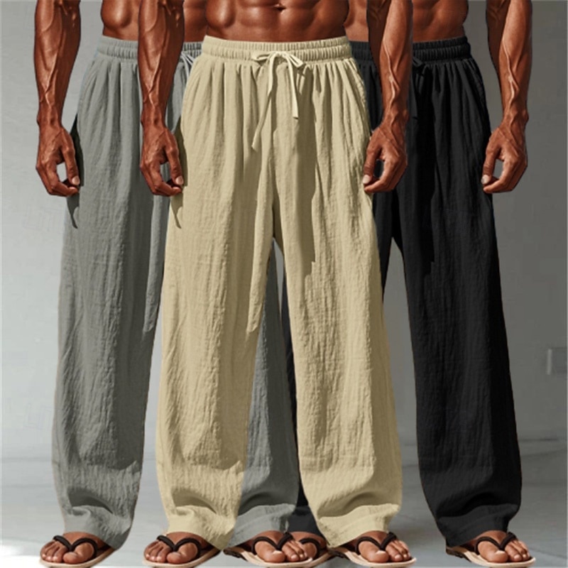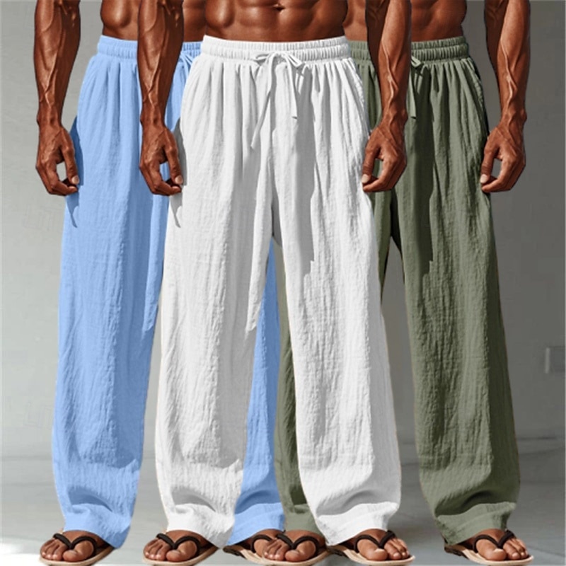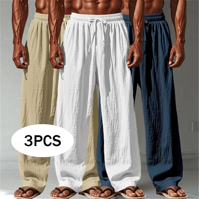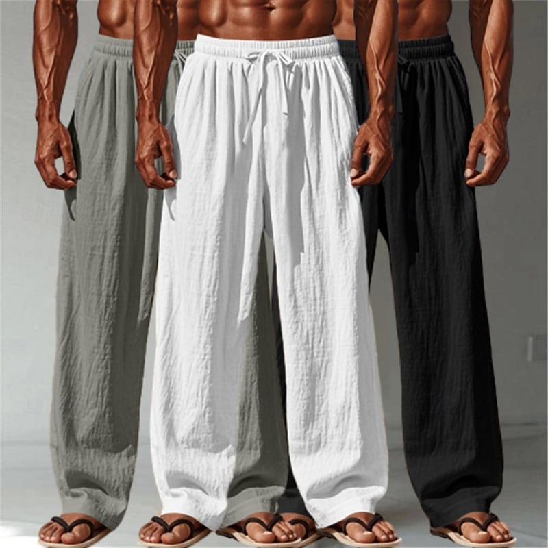 Men's Linen Pants Trousers Summer Pants Baggy Pants Beach Pants Drawstring Elastic Waist Straight Leg Plain Comfort Breathable Full Length Outdoor Casual Daily Vacation Fashion White+Black+Gray 3