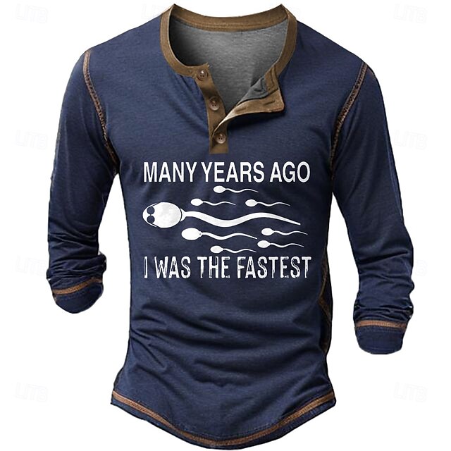 Men's Long Sleeve Henley Shirt - Funny "Many Years Ago I Was The Fastest" Sperm Graphic 1