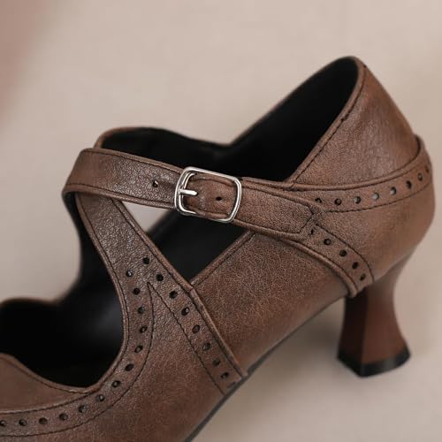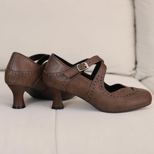 SACFOF Women's Mary Jane Low Kitten Heel Vintage Chunky Heels Ankle Strap Closed Round Toe Pumps Oxford Brogue Work Dress Shoes 5
