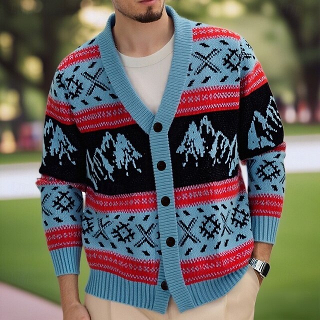 Men's Geometric Fair isle Sweater Cardigan Sweater V Neck Casual School Vacation Daily 3D Print Keep Warm Long Sleeve Spring Fall Winter Blue 3