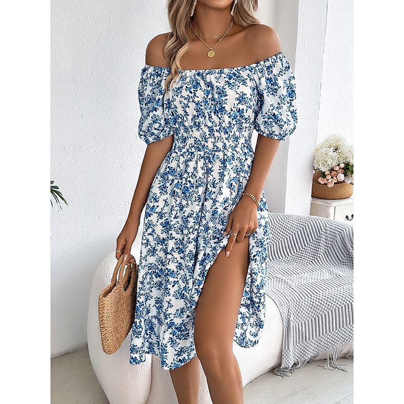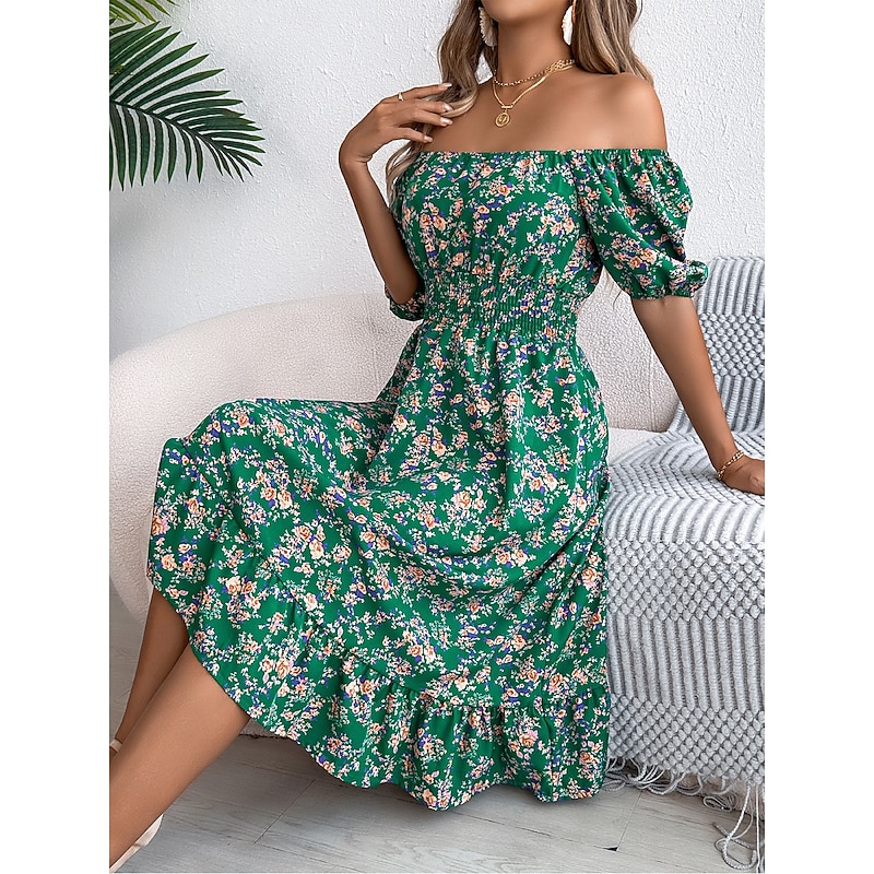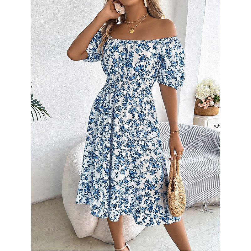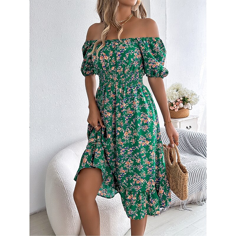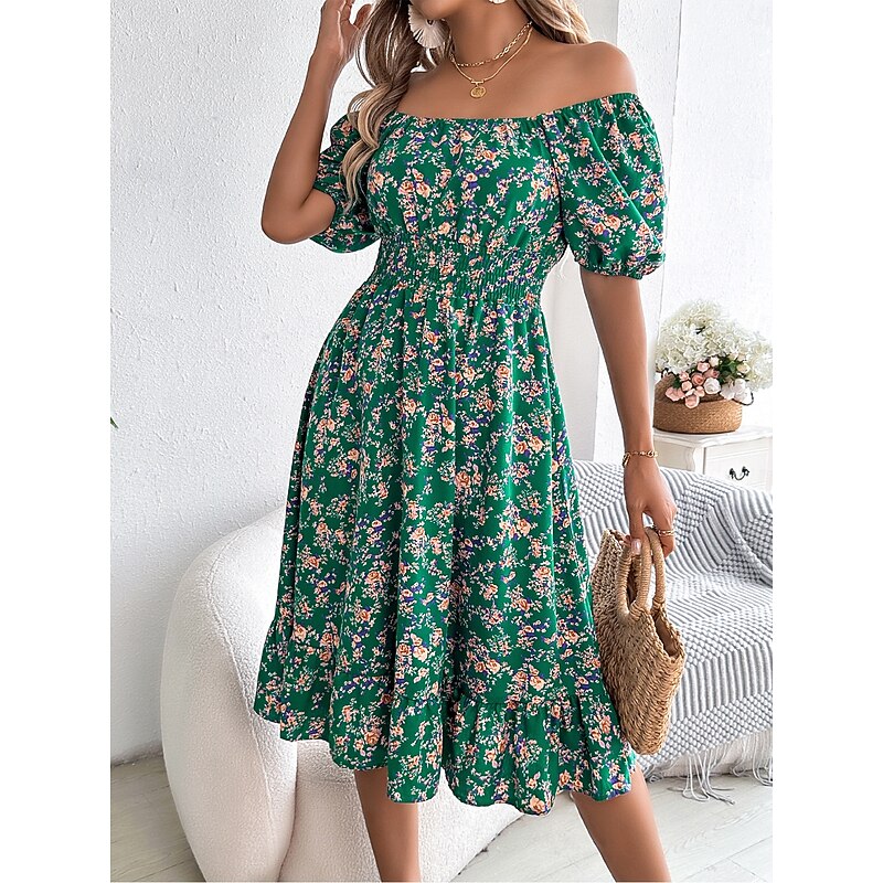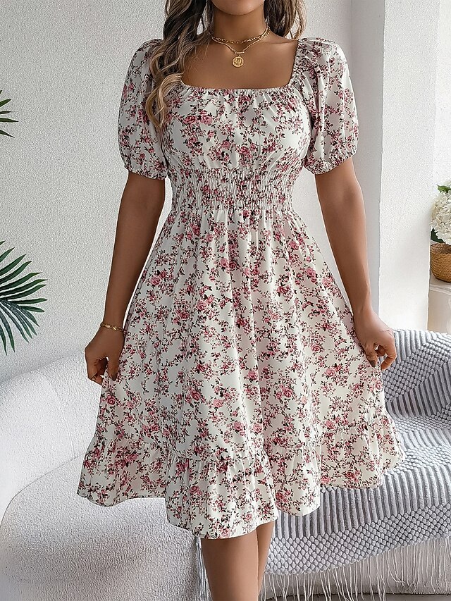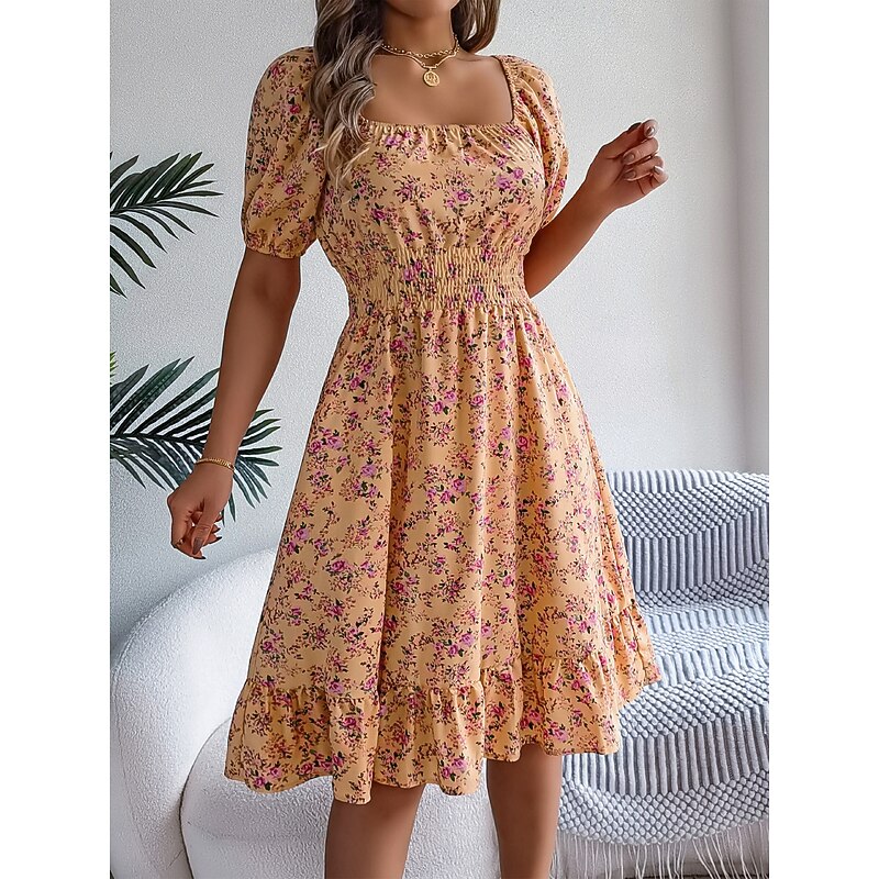 HOT ! Women's Midi Dress A Line Dress Milkmaid Dress Midi Dress Smock Dress Bohemia Cute Stylish Puff Sleeve Vacation Home Party Form Fit Floral Short Sleeve Square Neck Black White Yellow Red Summer