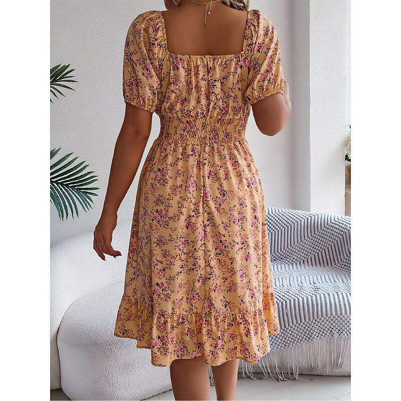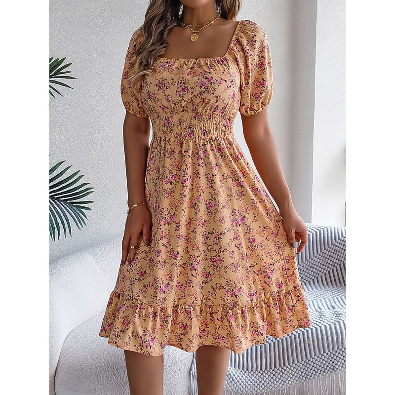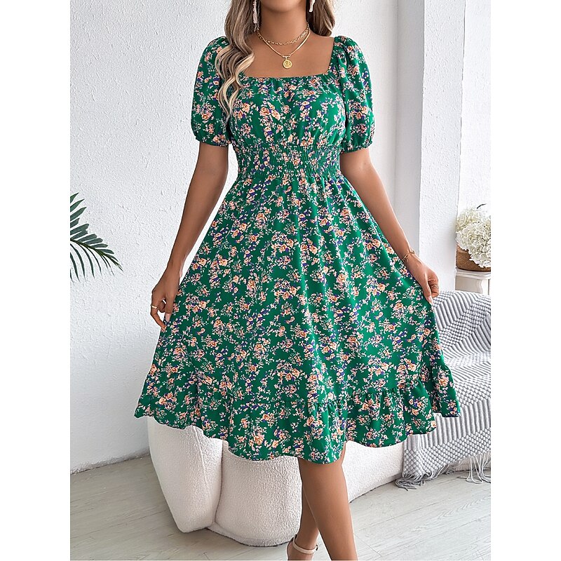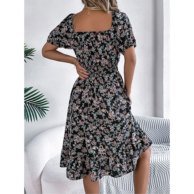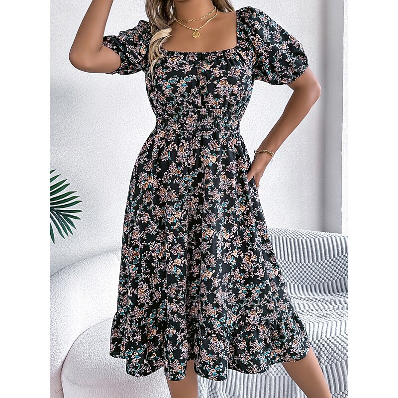 More information about Women's Midi Dress A Line Dress Milkmaid Dress Midi Dress Smock Dress Bohemia Cute Stylish Puff Sleeve Vacation Home Party Form Fit Floral Short Sleeve Square Neck Black White Yellow Red Summer