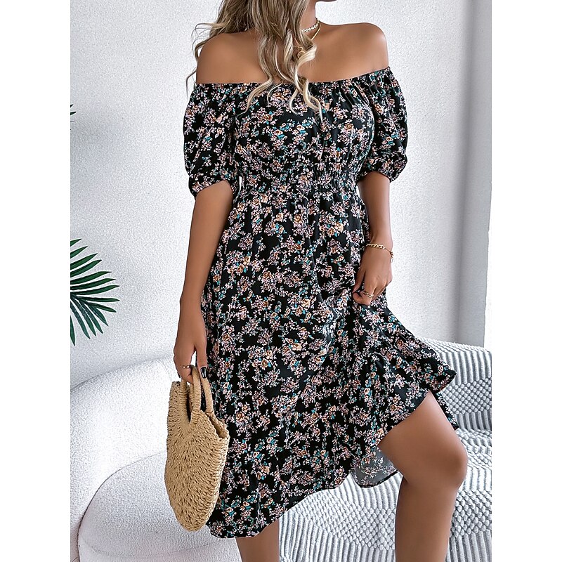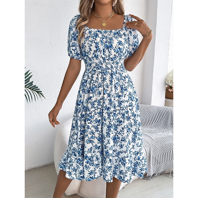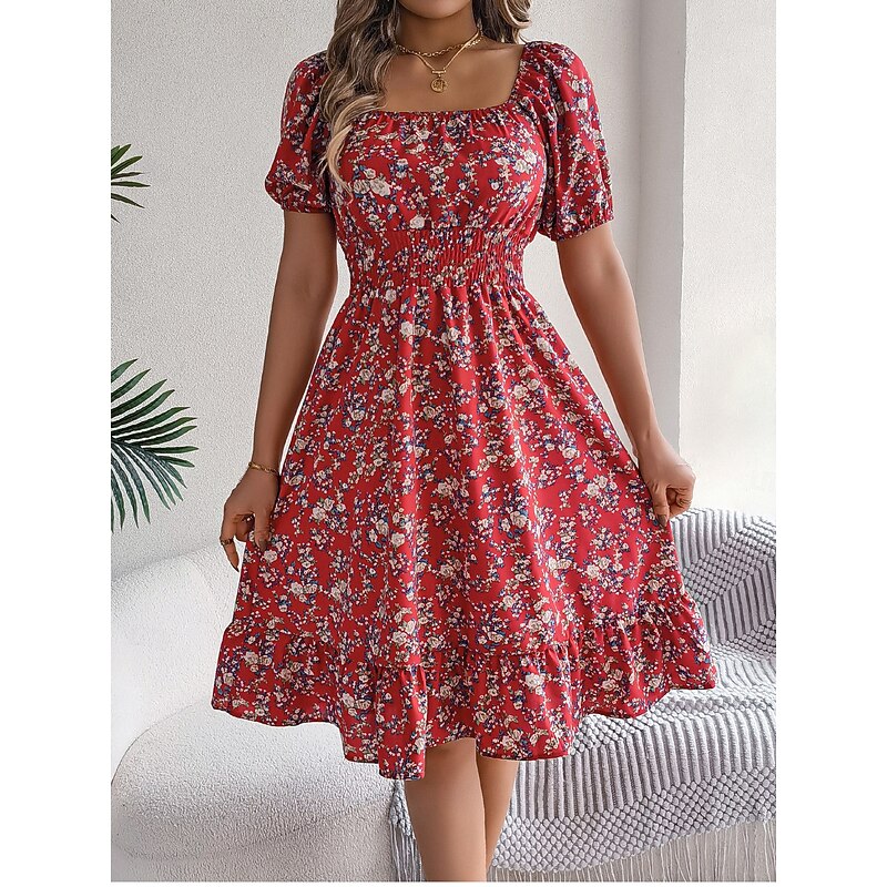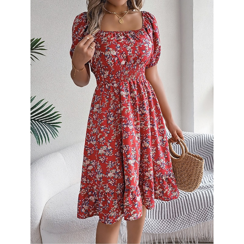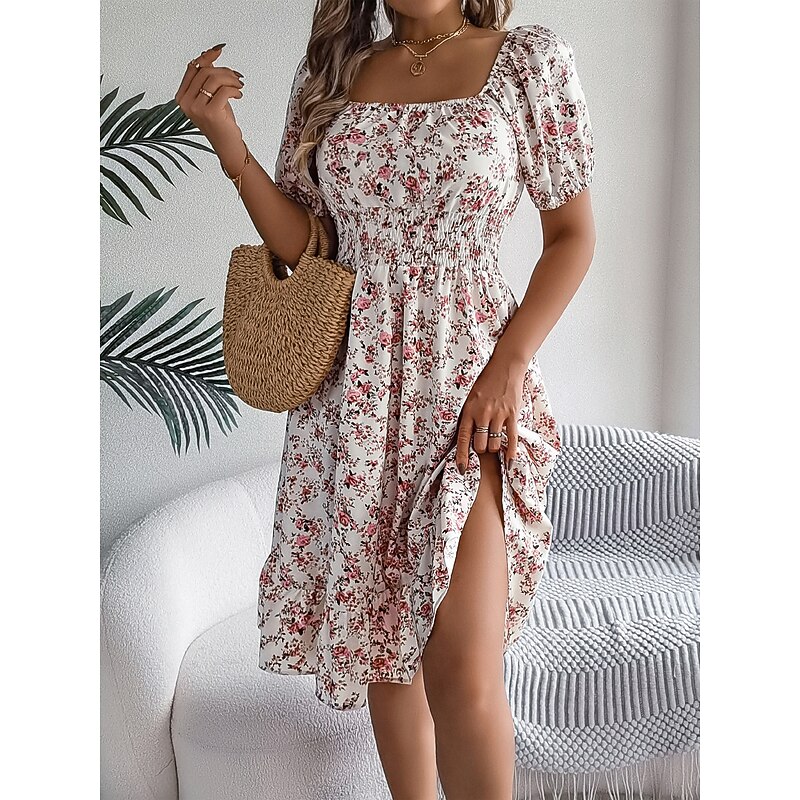 More information about Women's Midi Dress A Line Dress Milkmaid Dress Midi Dress Smock Dress Bohemia Cute Stylish Puff Sleeve Vacation Home Party Form Fit Floral Short Sleeve Square Neck Black White Yellow Red Summer