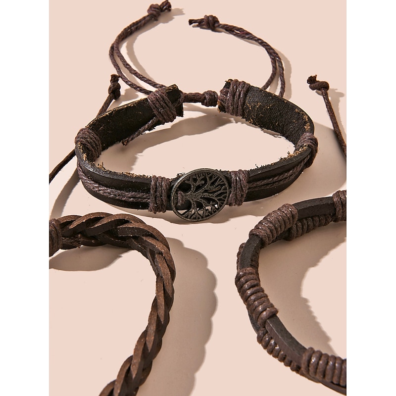 : This set includes three bracelets, each with unique elements: a metallic charm shaped like a tree of life to represent growth and strength, a woven bracelet with darker leather strands for a vintage-inspired appeal, and a braided bracelet with contrasting stitches that enhance its handcrafted feel. Together, they create a personalized style statement that resonates with earthy, bohemian vibes.