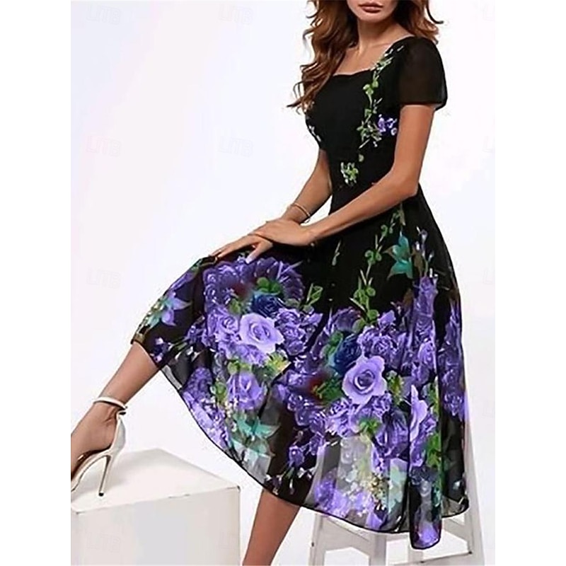 Highlights [Fabric] : Crafted from high-quality polyester, this women's dress is lightweight and breathable, making it an ideal choice for the summer season. The fabric's micro-elastic properties ensure a comfortable fit and maintain ease of movement throughout the day. [Fit] : Designed with a classic A-line silhouette, this dress offers a flattering fit for a variety of body types. The regular fit allows for both comfort and style, making it a versatile addition to your wardrobe. [Design Highlights] : The dress features a sophisticated square neckline and short sleeves, adding elegance to the overall design. The skirt is decorated with a beautiful floral print, transitioning from a solid color to a delicate gradient that enhances its romantic appeal. These design elements combine to create a chic, feminine look. [Occasions] : Perfect for vacations, streetwear, and holiday gatherings, this dress suits a wide range of occasions. Whether you're headed to a casual outing or a semi-formal event, this dress offers a stylish and adaptable choice. [Size Range] : Available in a variety of colors including Blue, Green, Red, Purple, and Fuchsia, the dress comes in sizes S, M, L, XL, 2XL, and 3XL, ensuring a perfect fit for different body types.