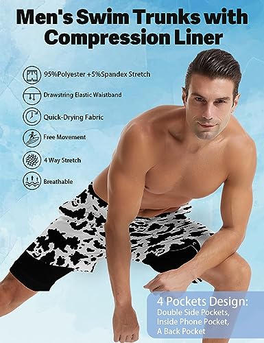 • 【Quick Dry 2 in 1 Swim Trunks for Men】This milk cow printed swim trunks with compression liner is made of 4 way stretch fabric---95% polyester and 5% spandex, lightweight outer and breathable inner, quick dry to keep you comfort all day long. M-5XL sizes are available for most of teen, youth, men.