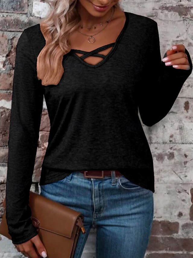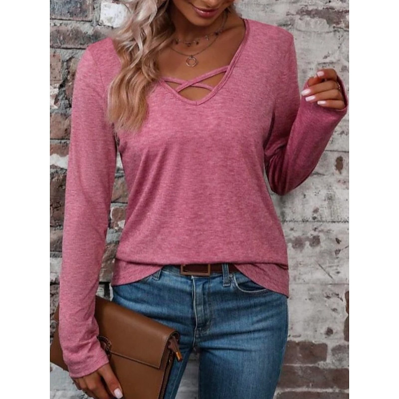 More information about Women's T Shirt Plain Fashion Modern Casual Long Sleeve V Neck Regular Tops Daily Weekend Black Fuchsia Khaki Spring Fall