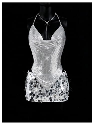 SHENHE Women's Sexy Sparkly Halter Top Sequin Rhinestone Open Back Cowl Neck Chain Clubwear Rave Tops 5