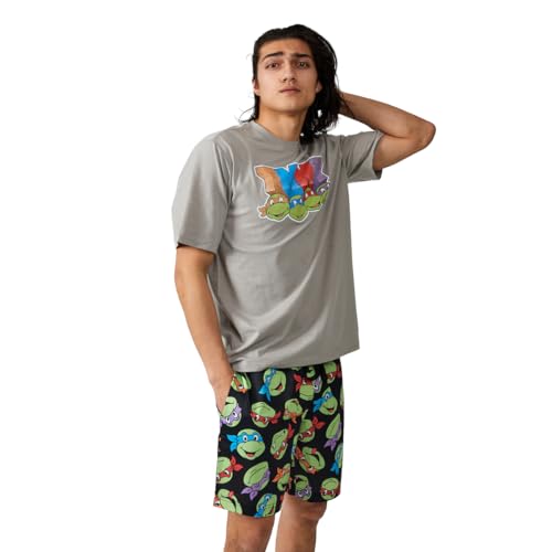 • CUSTOM DESIGN: The gray t-shirt features a big, colorful graphic of Michelangelo, Donatello, Rafael, and Leonardo alongside a bold "TMNT," while the black lounge shorts boast an all-over character print.