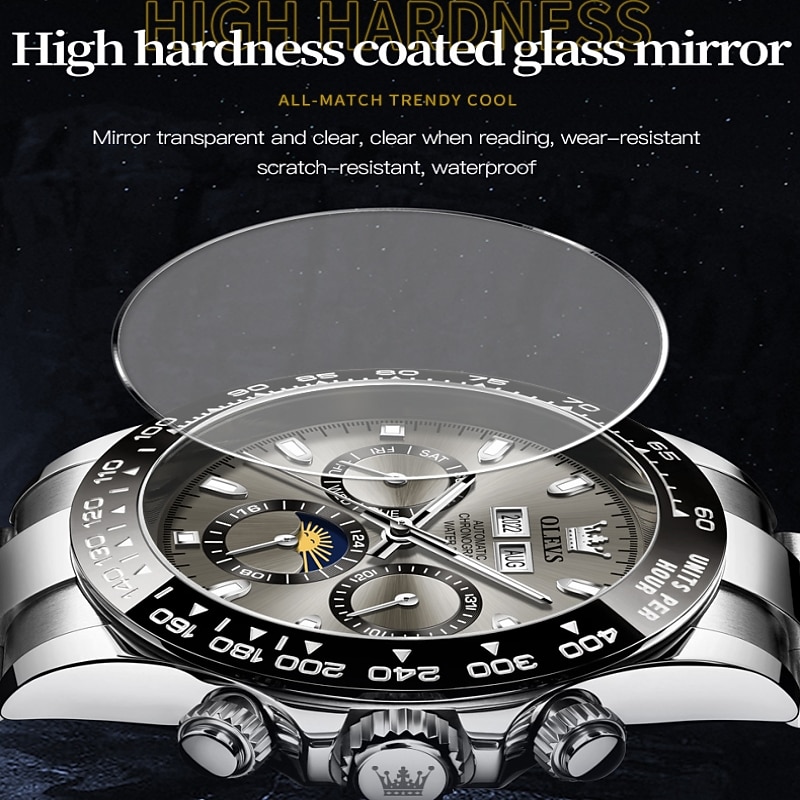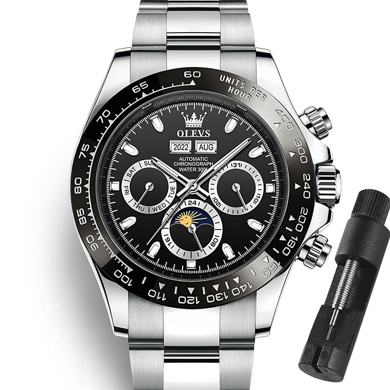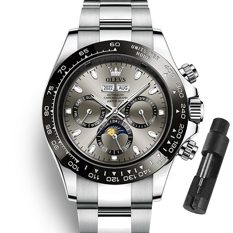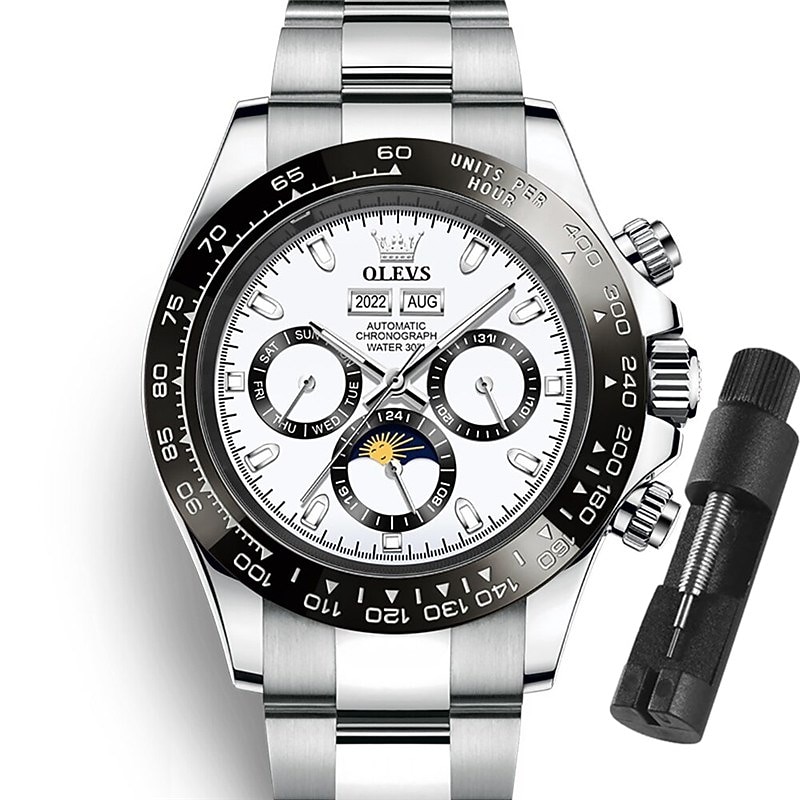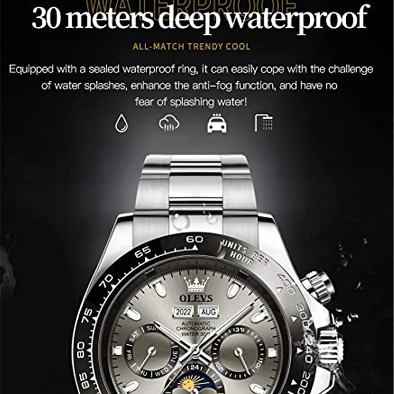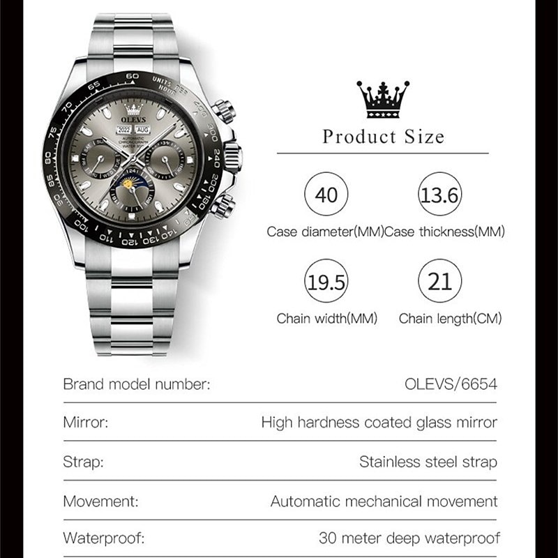 HOT ! OLEVS Mens Automatic Watches Silver Bezel Stainless Steel Luxury Dress Mechanical Moon Phase Waterproof Wrist Watches for Mens Multi Date